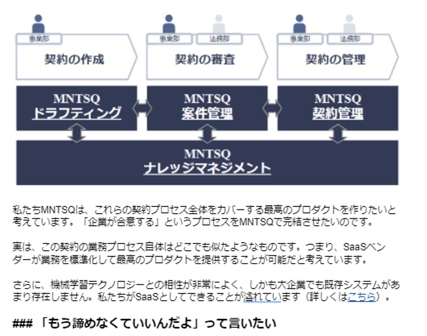 私たちMNTSQ(モンテスキュー)は、機械学習テクノロジーと日本トップのローファームの力を掛け合わせることで、この問題に立ち向かい、誰もがフェアな契約を一瞬で結ぶことができる世界を目指しています。