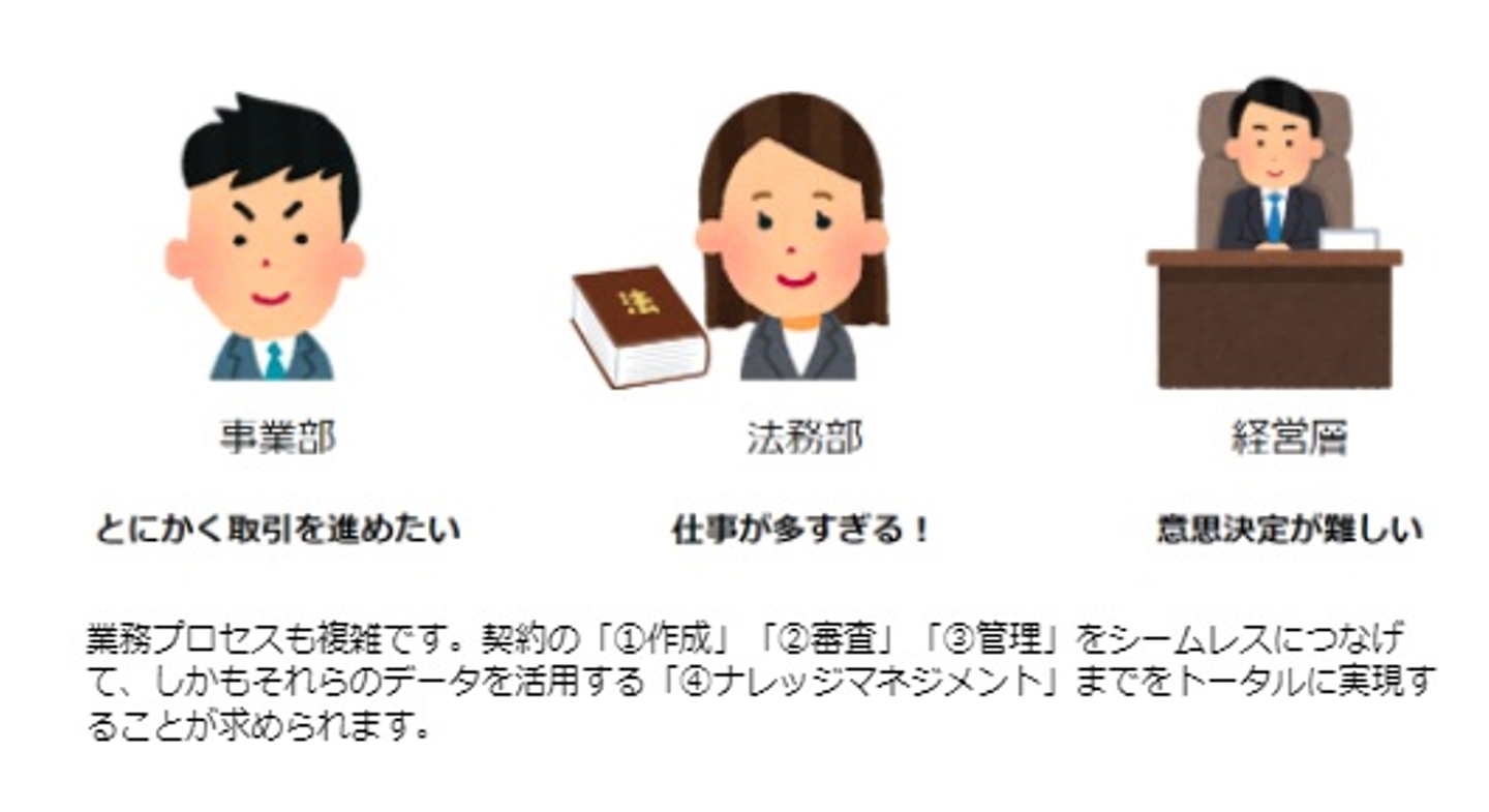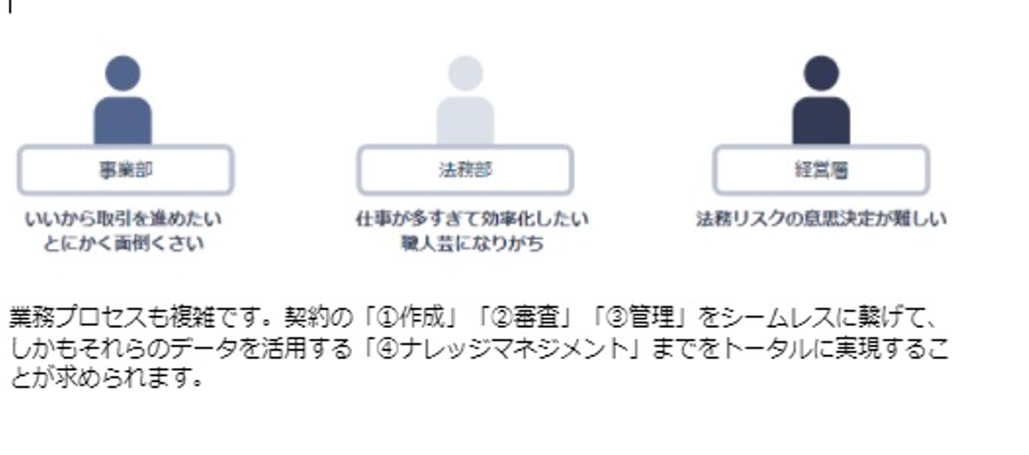 大企業の契約業務を一気通貫でDXする基幹システムの提供を通じて、リーガルリスクマネジメントの高度化と業務の高速化の実現を目指しています。