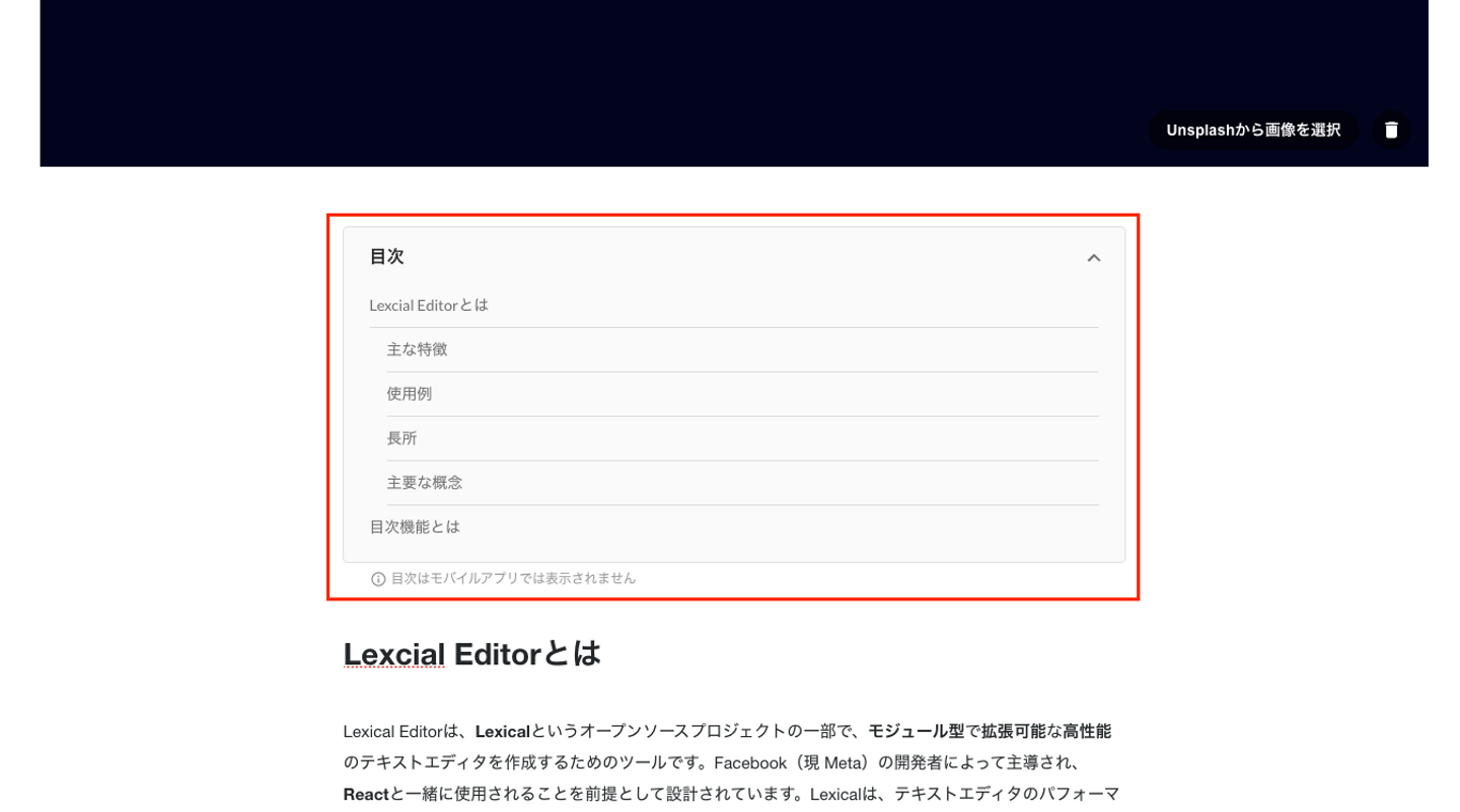 import { TableOfContentsPlugin } from "@lexical/react/LexicalTableOfContentsPlugin";TableOfContentsPluginが Editor内のHeadingタグを取得してくれるので、目次機能に必要な初期実装を多くスキップすることができました。