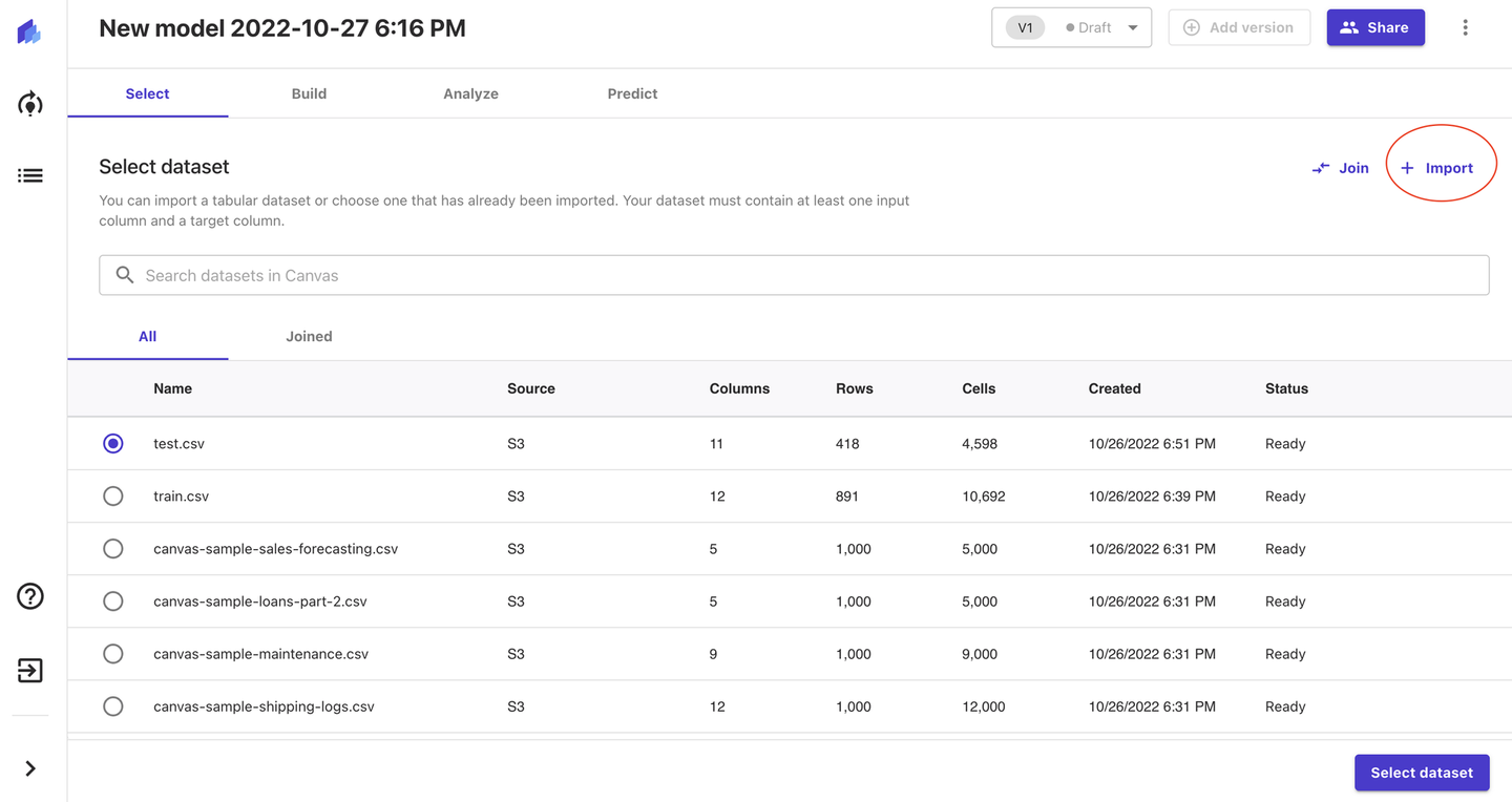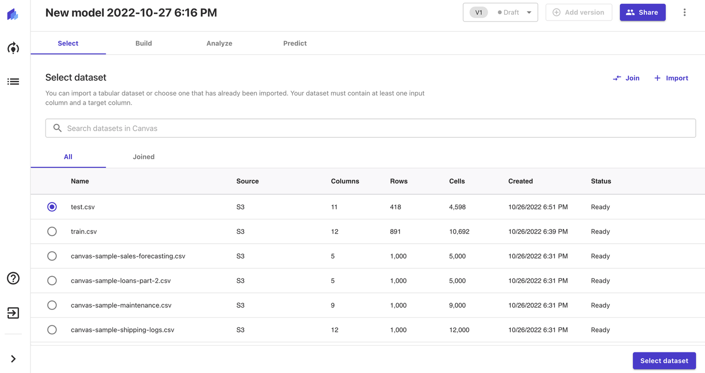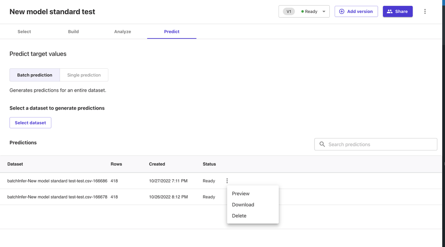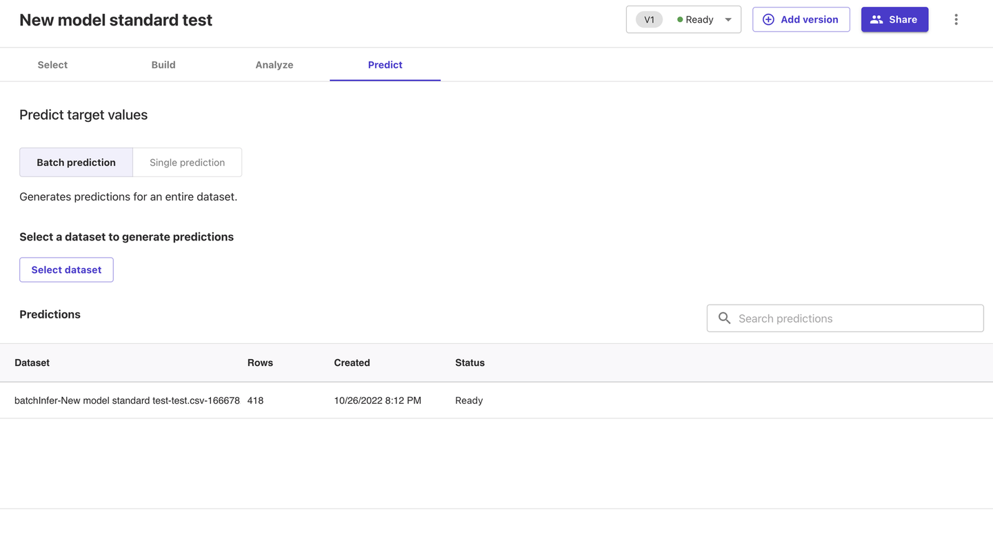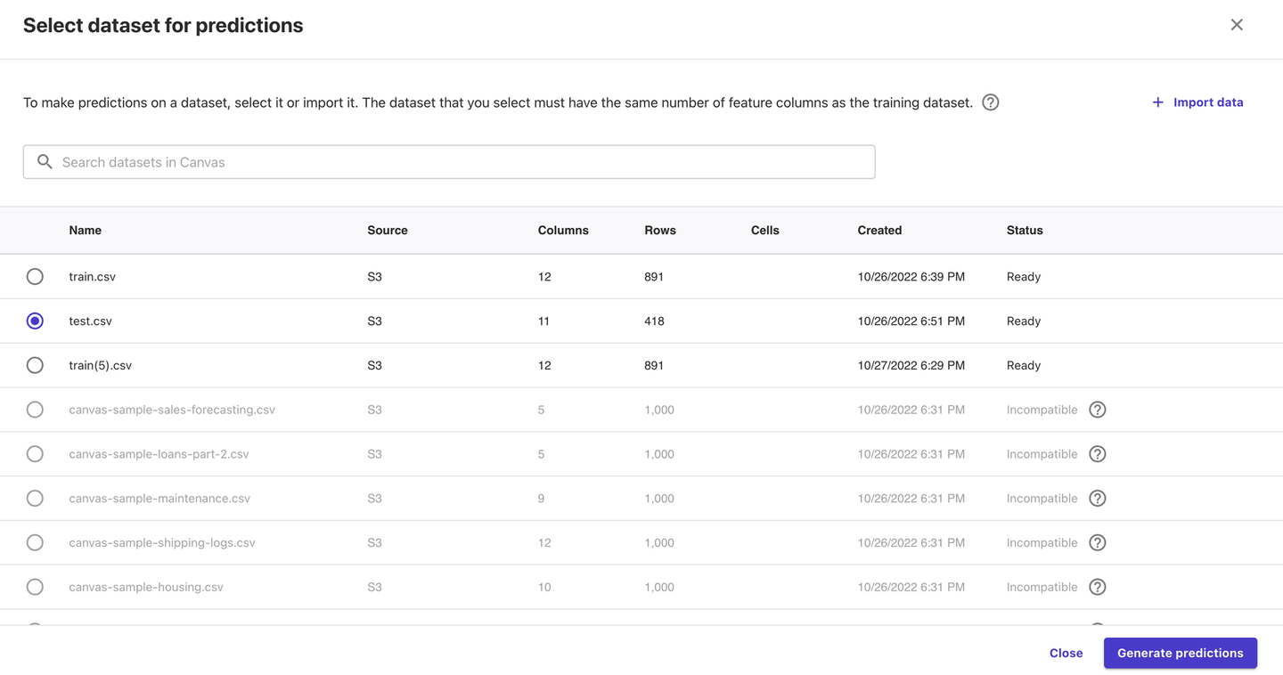 test.csvを選択し、「Generate predictions」を押下すると予測が開始します。