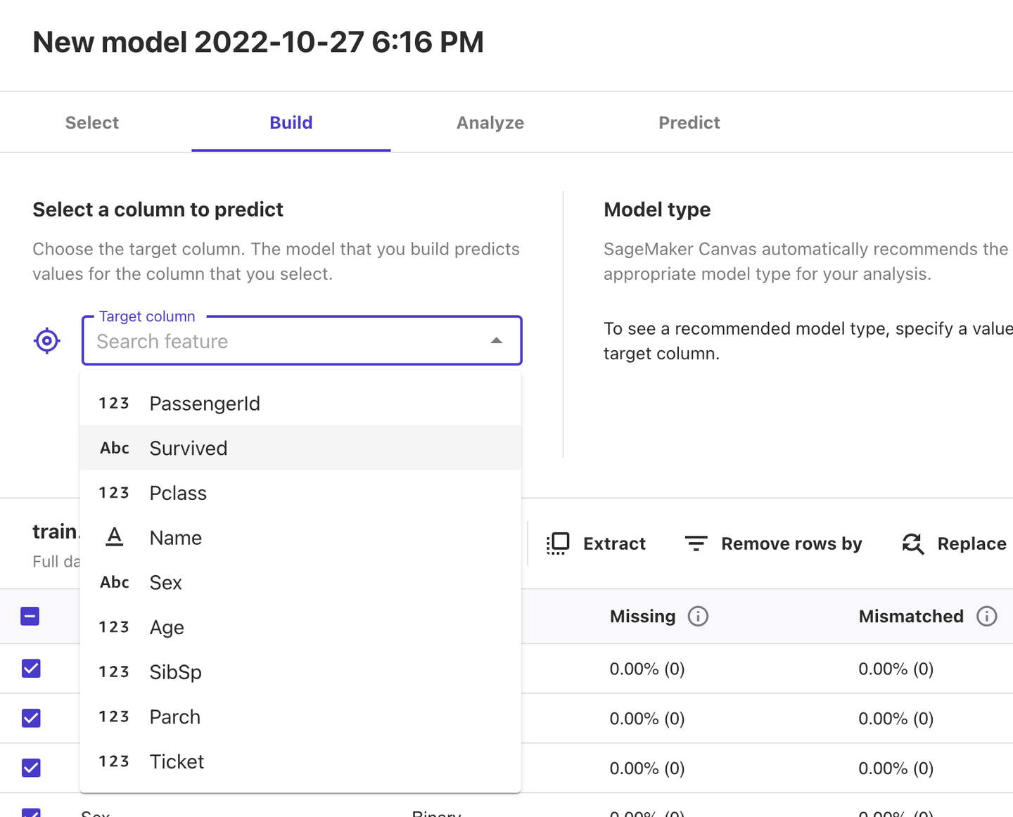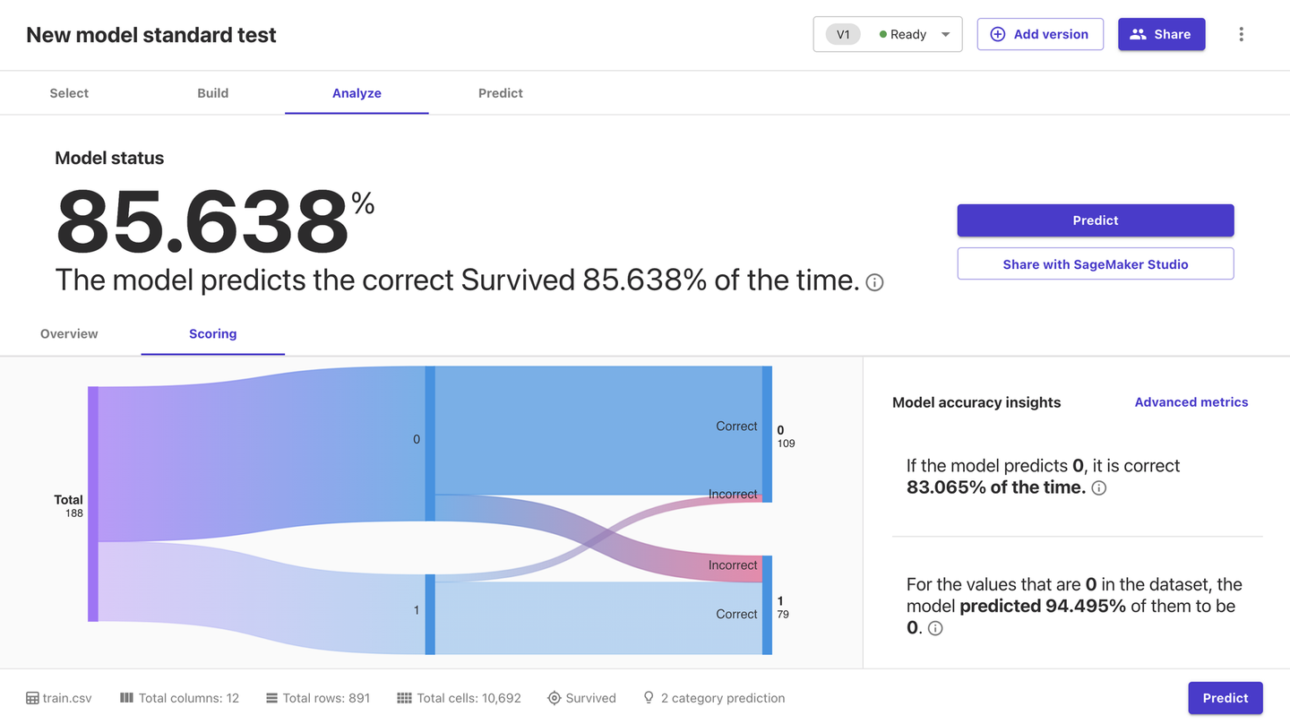以前チュートリアル通りに機械学習を進めた際の結果が75%だったので、ただ何もせずにSageMaker Canvasにデータを通すだけで、