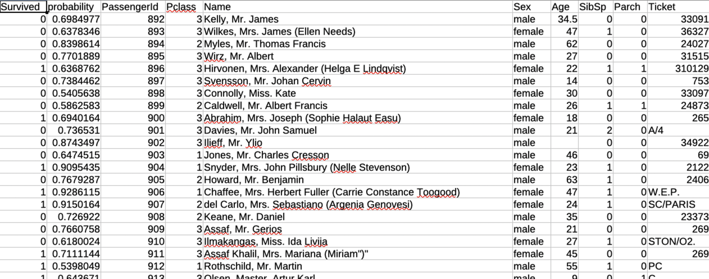 csvの中身は下記のようになっており、予測値(probability)と回答(今回はSurvived)が得られます。