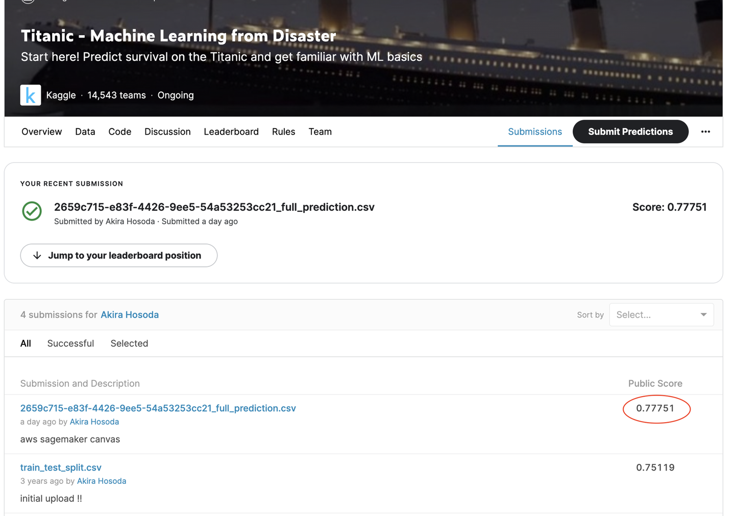 検証するためにはKaggleのタイタニックコンペティションのページより、予測結果をアップロードします。
