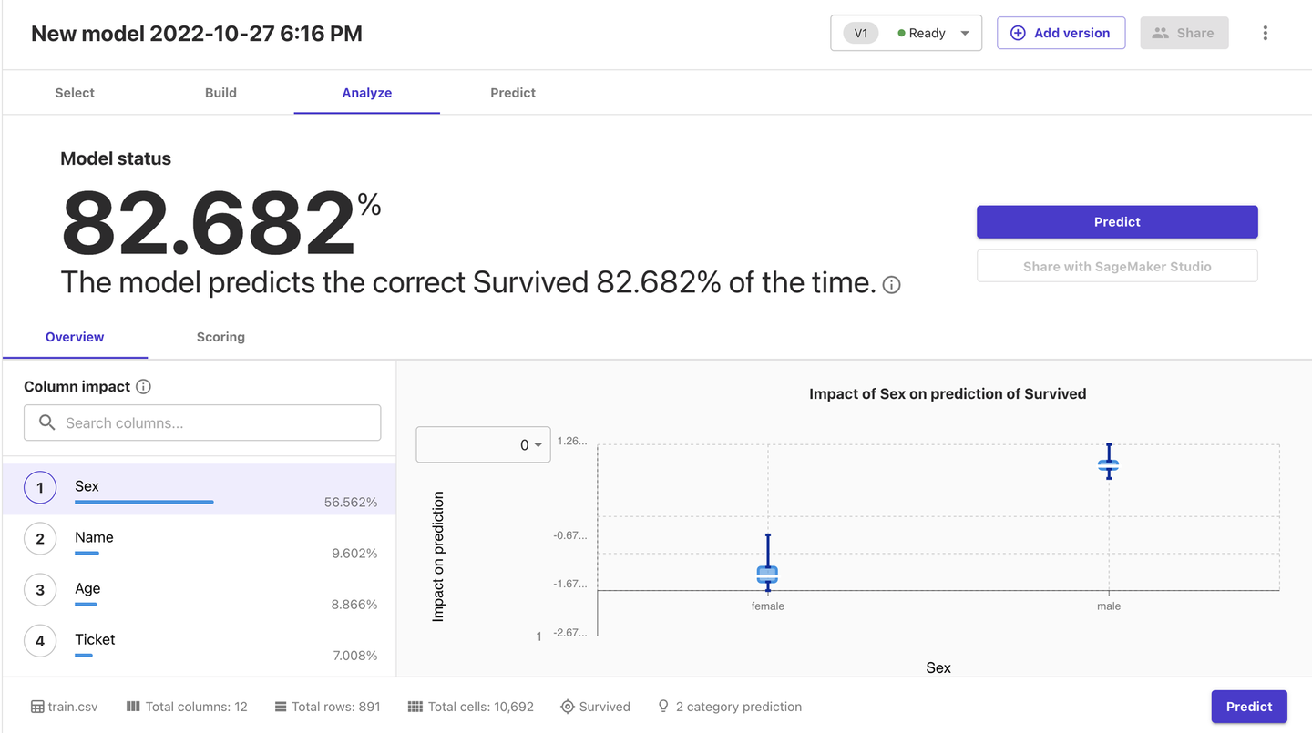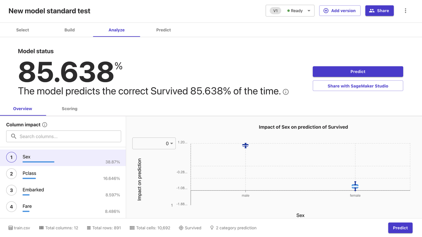 SageMaker Canvasにはデータしか与えていないにもかかわらず、これだけの結果が得られてしまうのはすごいですね。