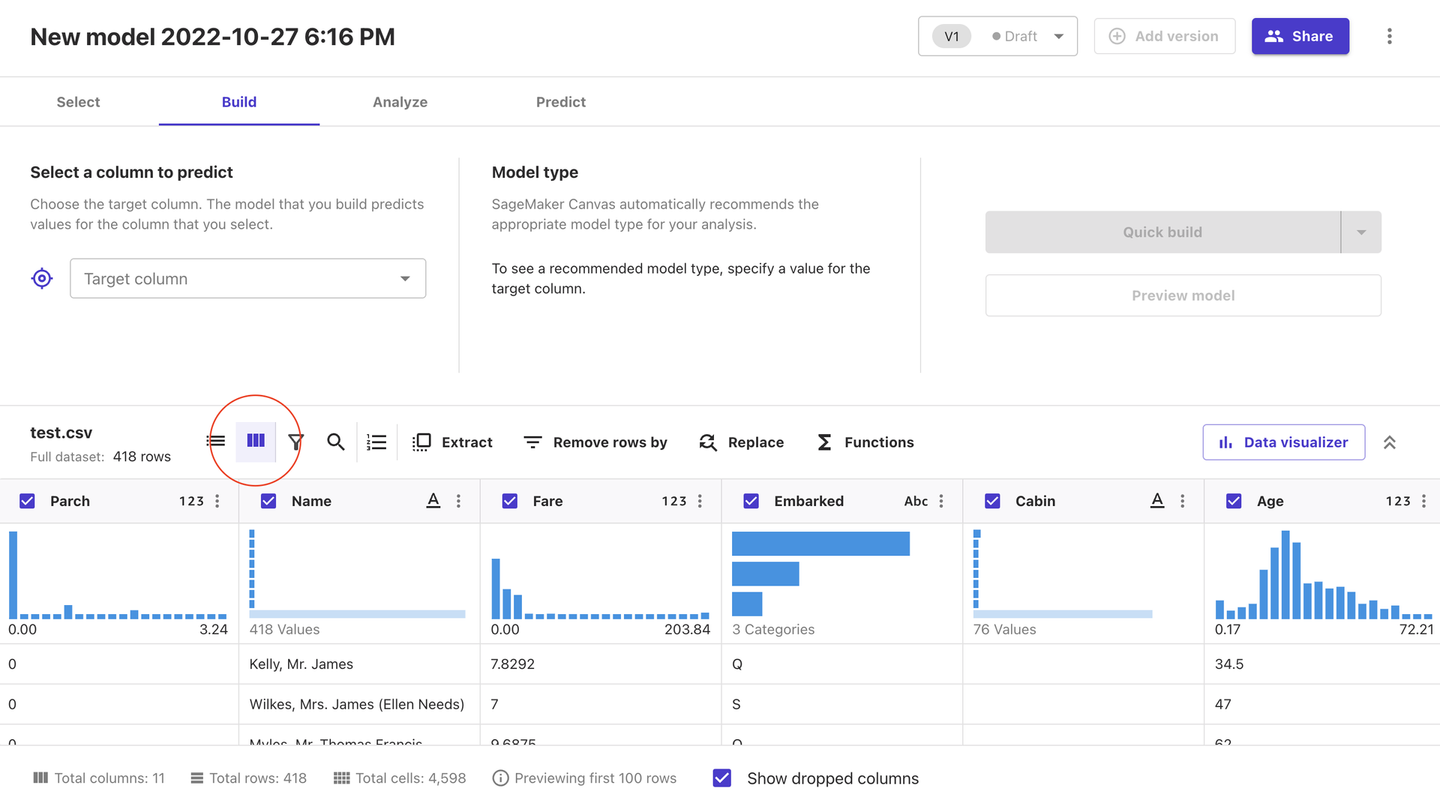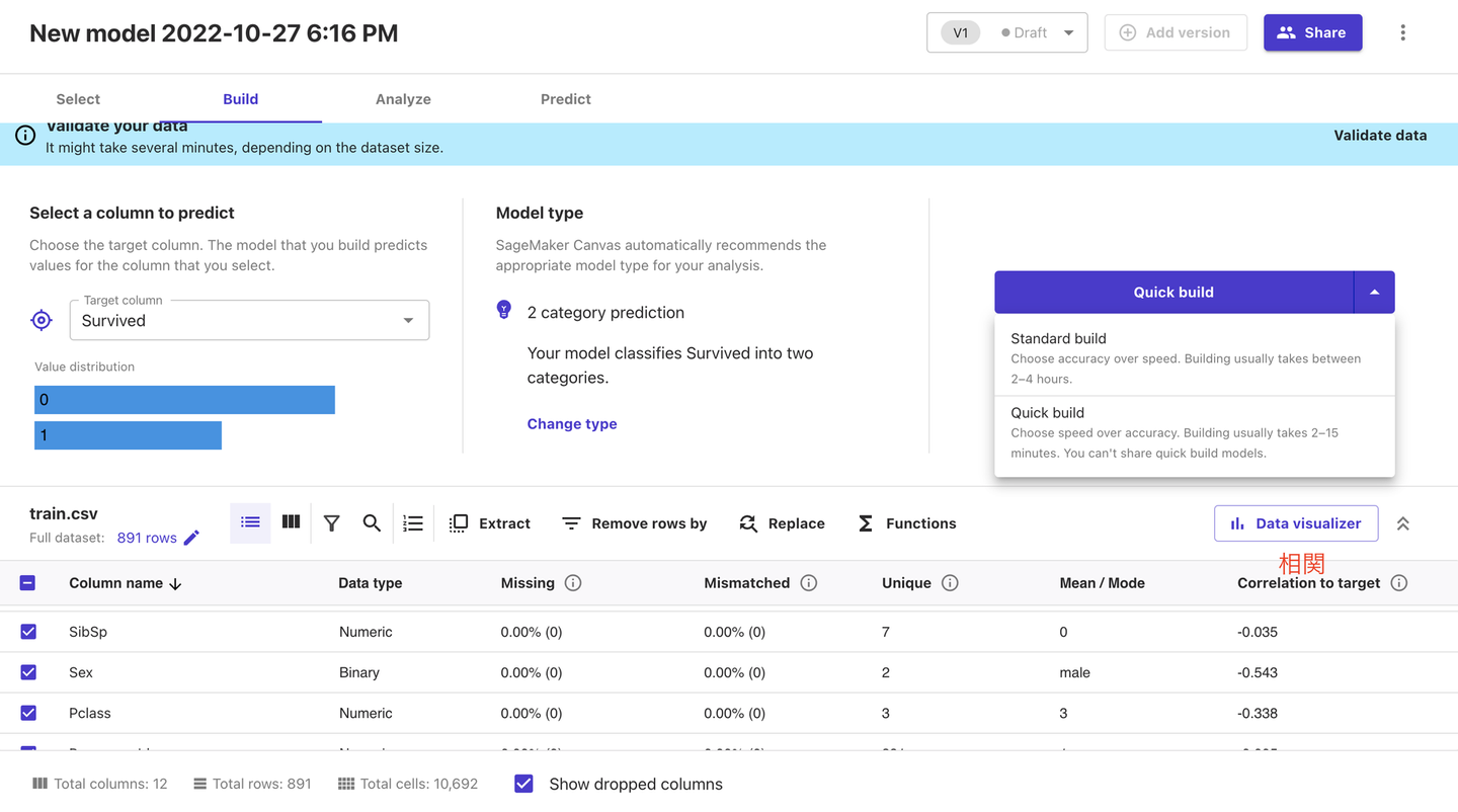 Target columnを選択すると、それぞれのカラムとTarget columnとの相関が表示されるようになります。