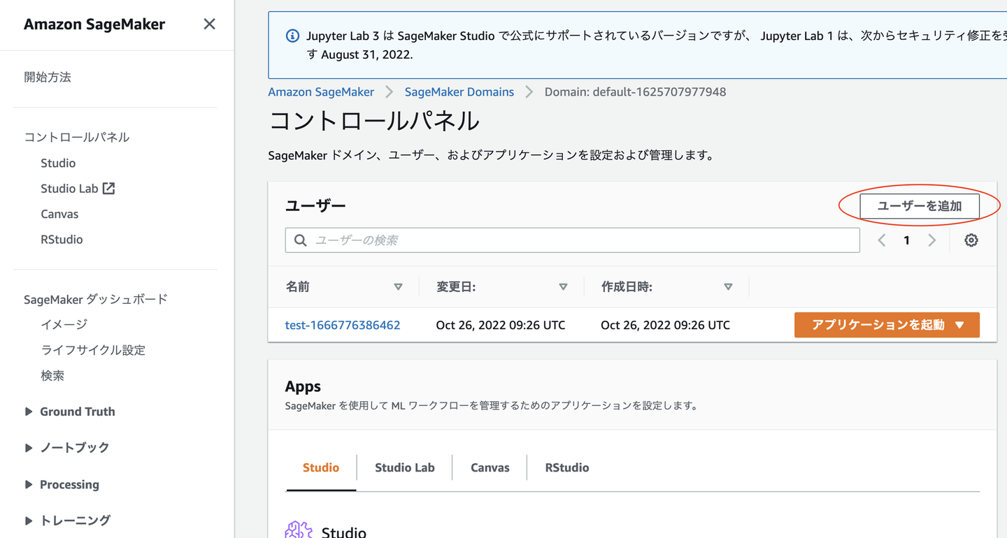SageMaker のコントロールパネルへアクセス後、「ユーザーを追加」を押下し、すべてデフォルトのままで構わないのでユーザー作成をしてください。