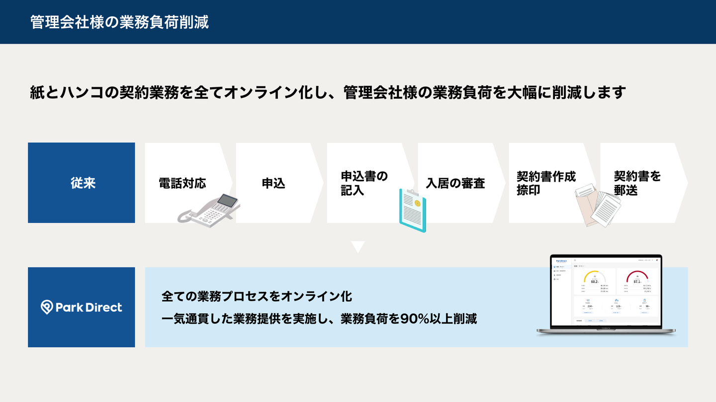 (下野)私たちも当然御社のPark Direct経由のお客様がどれくらいのスピードでついていらっしゃるのかは拝見させていただいておるのですが、約5営業日かかっていたものが、おおむね数時間で契約完了になっています。契約完了までにかかる時間としては90%以上のお時間を削減できているかと思います。
