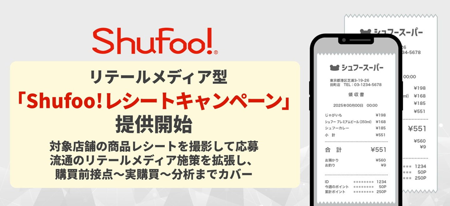 詳細:「リテールメディア型「Shufoo!レシートキャンペーン」提供開始 対象店舗の商品レシートを撮影して応募」