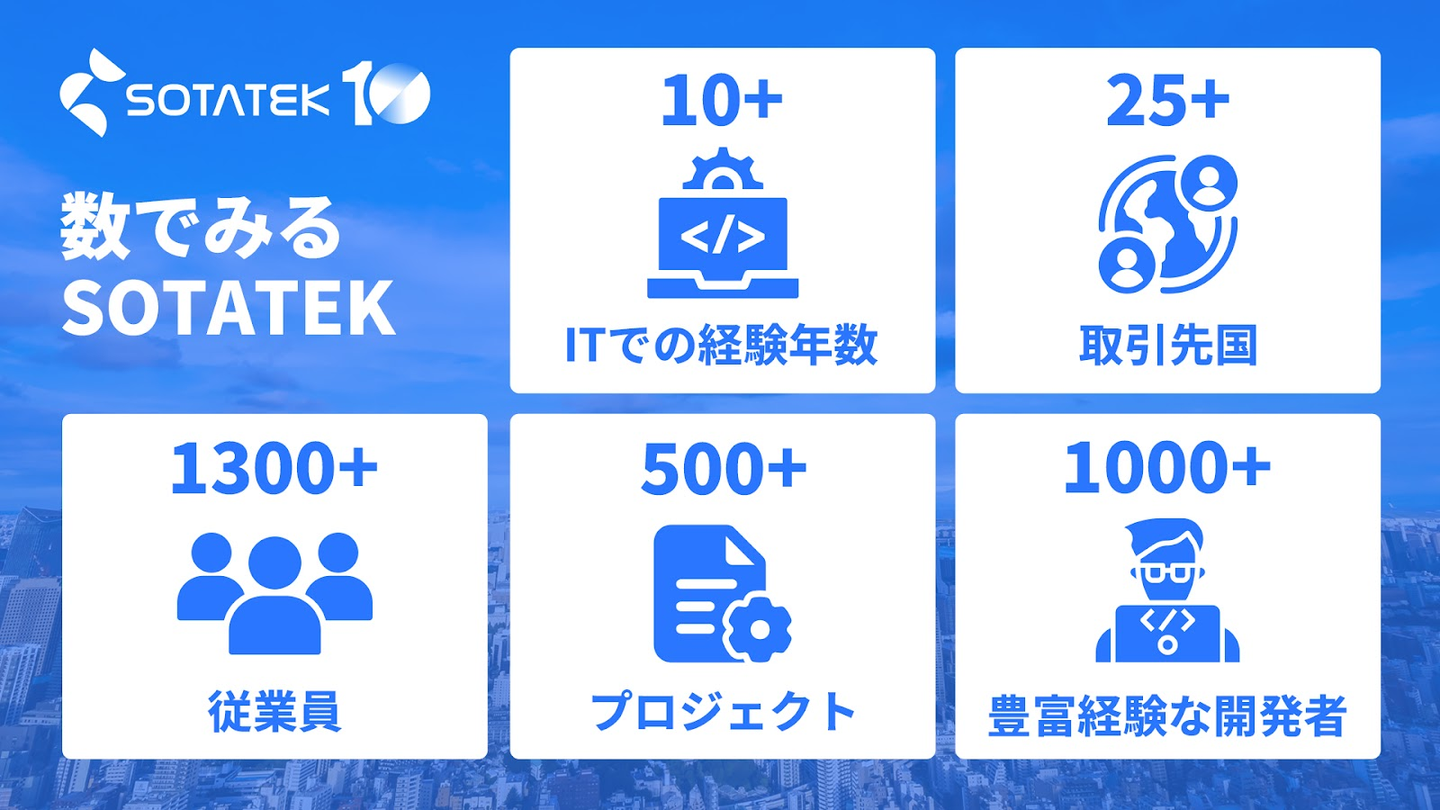 10年間で、SotaTekのチームは20名未満から1,000名超へと成長しました。日本では、スタートアップから中堅・上場企業まで、さまざまな業界・規模のクライアントに対応しています。