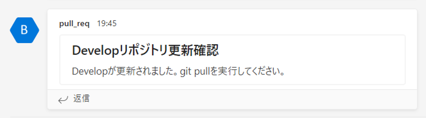 myTeamsMessage.text("Developが更新されました。git pullを実行してください。")