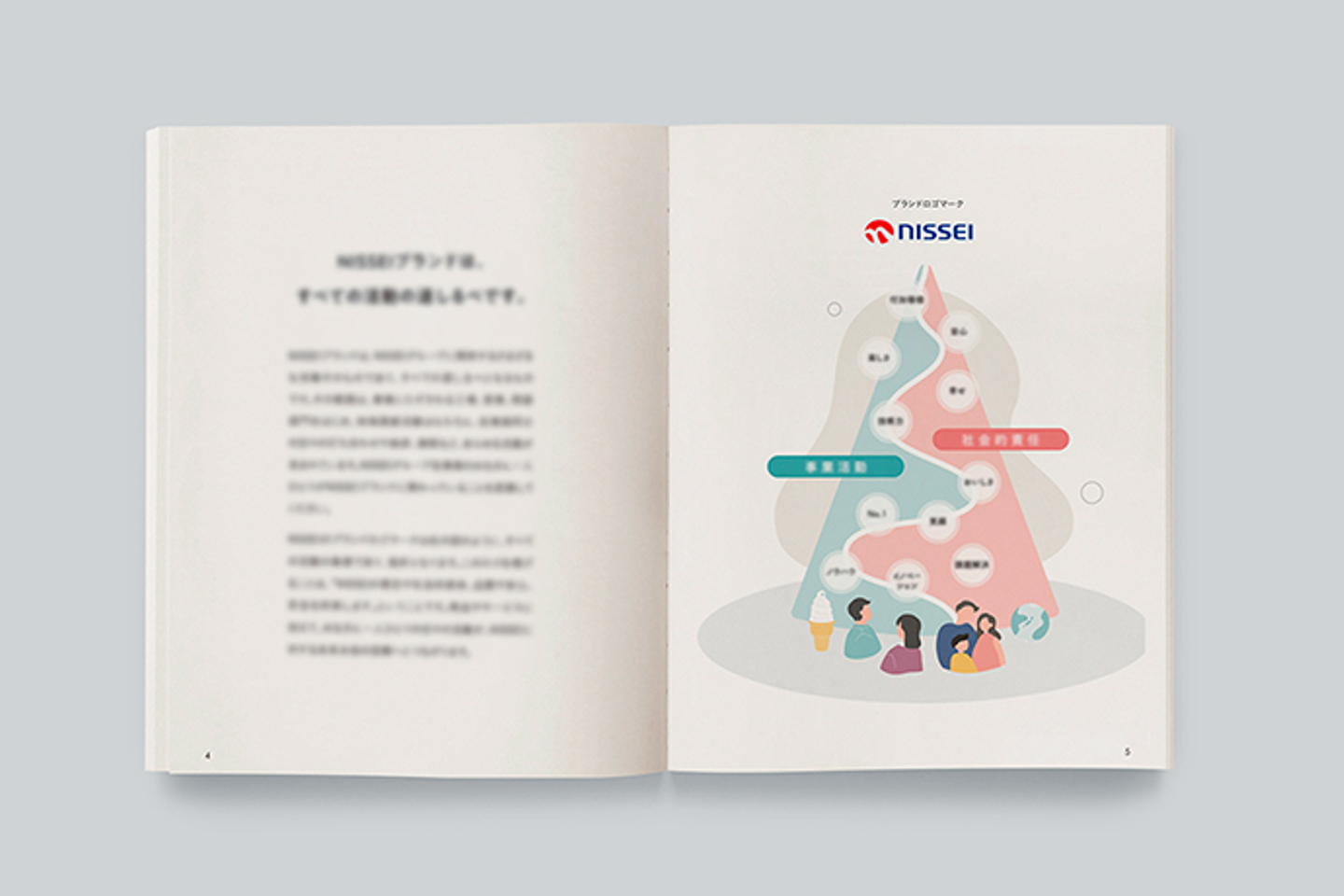 ブランドの理念体系や行動指針はもちろん、NISSEIブランドの真髄やコーポレートメッセージに込められた想いなどが載せられており、より深く会社のことを理解するのには欠かせないアイテムです。なかでも従業員の皆さまにとっての「笑顔のみなもと」を紹介した特集ページは、それぞれが自社のコーポレートメッセージについて考えるとともに、他部署の方の想いに触れる一つのきっかけにもなりました。NISSEIらしいあたたかな内容で、私にとっても印象深いページです。