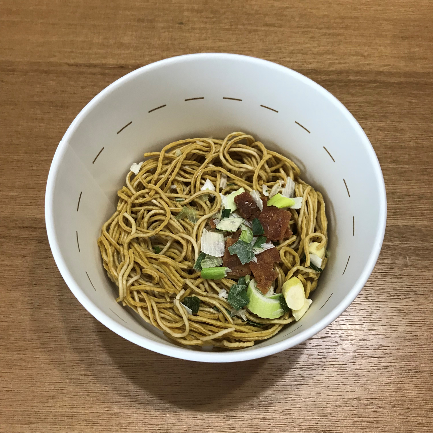 袋麺とかやくをカップの中に入れ、お湯を点線まで注いで待つこと6分(「栄養ホールドプレス製法」で麺の内側に栄養素が閉じ込められて太くなっていることもあり、少し長めですね)。