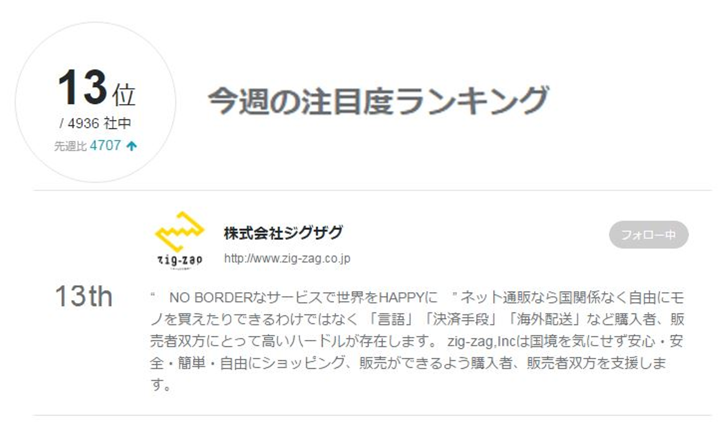 Wantedly今週の注目度ランキング13位まで上がってきました! (4936社中)