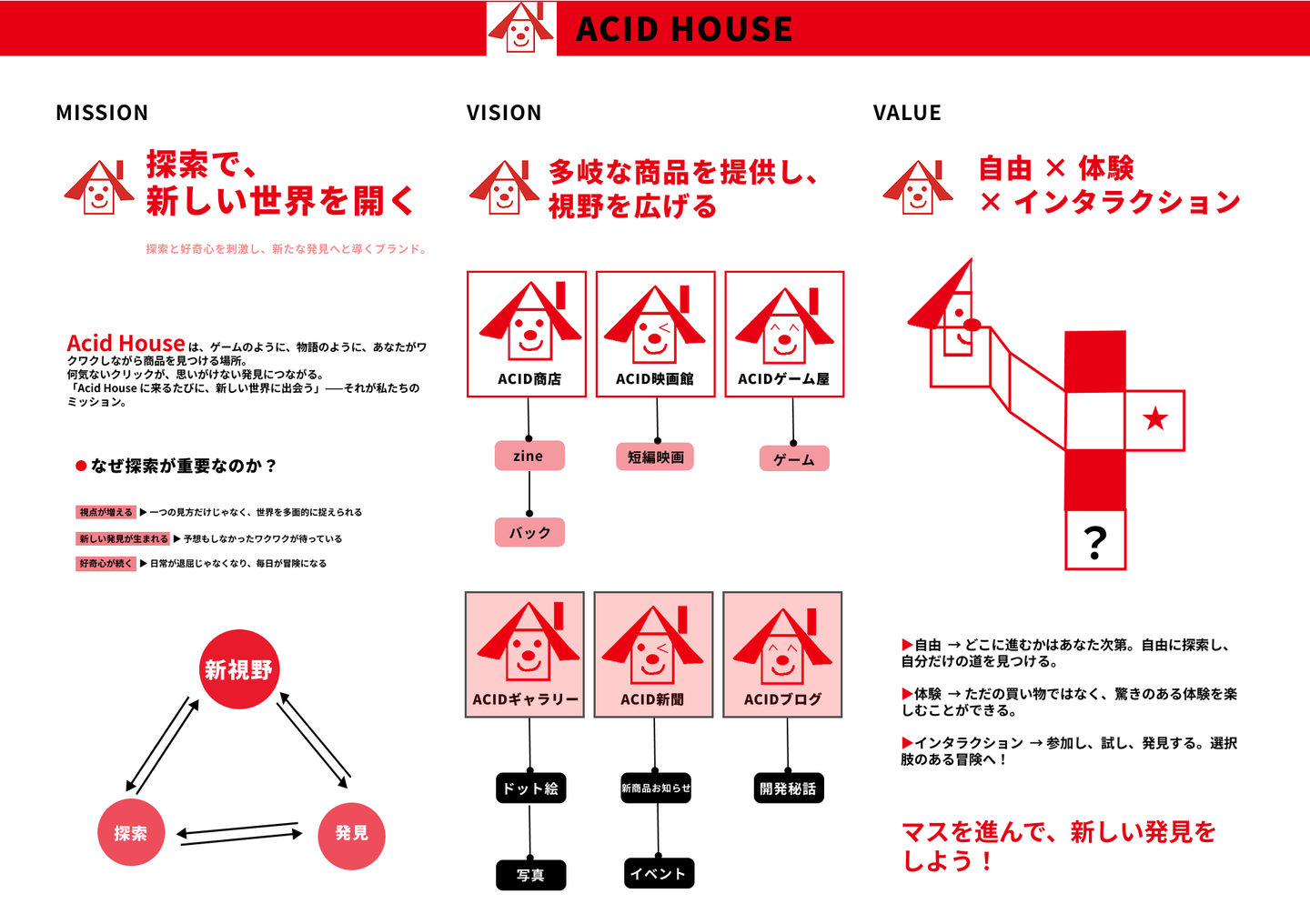 「ここはどんな場所?」「ACID HOUSE って何?」という疑問に、ブランド自身が語りかけるスタイルです。