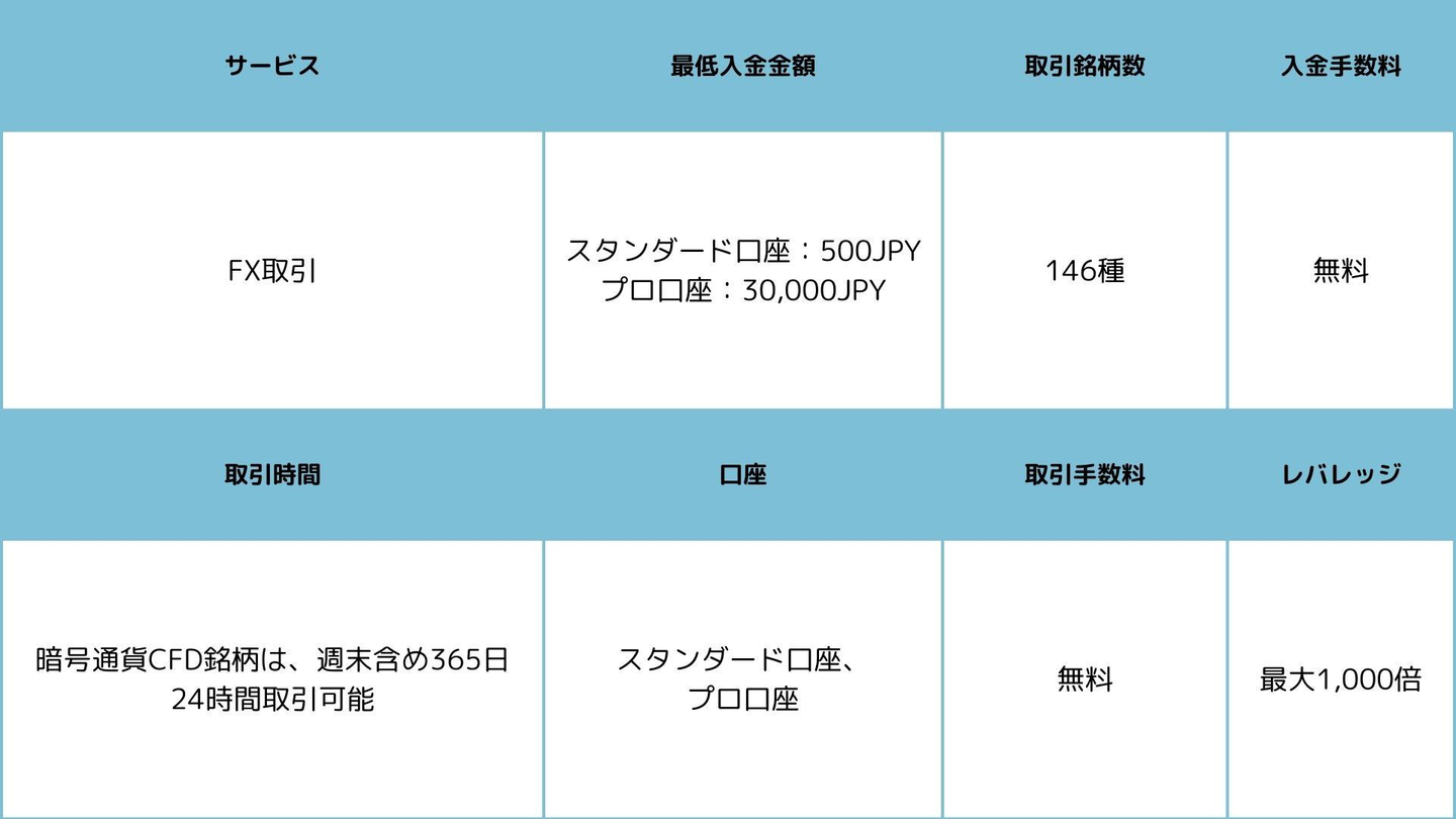 - 広い商品ラインナップ:通貨ペアだけでなく、仮想通貨、貴金属、コモディティ、インデックスも取引可能。