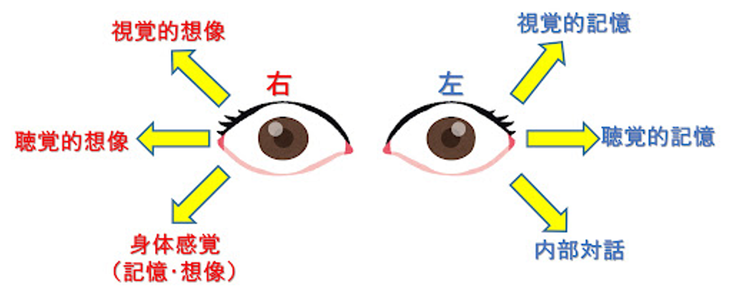 この図で何が分かるかというと、相手が自分自身の右側を見て考えてる時は、脳の中で何かを想像したり、作ったりしていることを意味します。嘘は想像なので、その場合も右を見ます。左は記憶なので、何かを思い出そうとしている時は左を見る傾向があります。