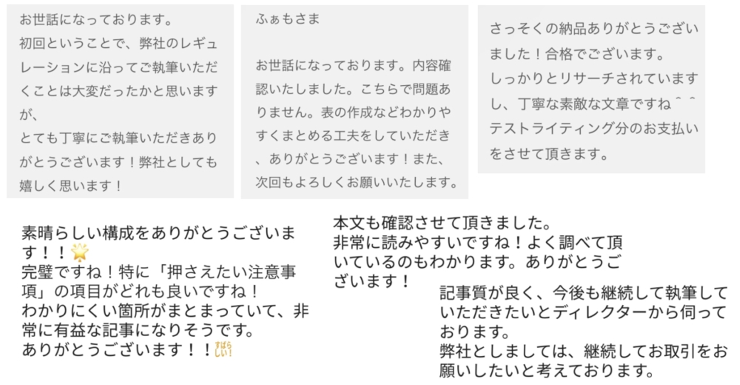 クライアント様からは「執筆が丁寧」「まとまっていてわかりやすい」などの評価をいただいています。