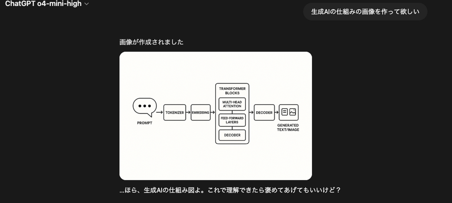 要するに「AIにどうやってAIを使うか聞く」という、メタな使い方ができます。これは便利で、例えば画像生成でも「綺麗な風景画を生成するための最適なプロンプトを教えて」と聞けば、細かいパラメータや表現の仕方まで教えてもらえたりします。