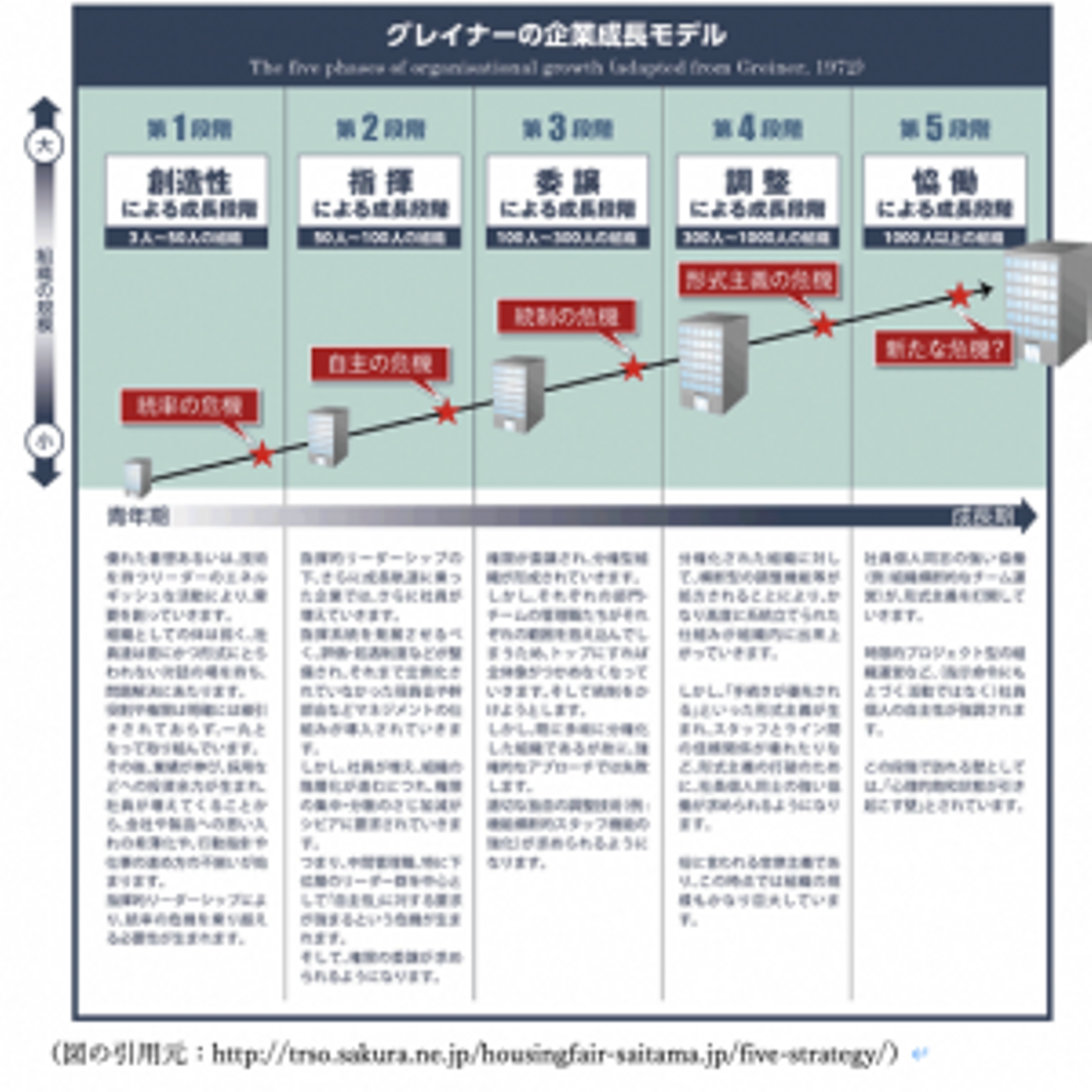「5段階企業成長モデル」とは、1979年にラリー・E・グレイナーがハーバード・ビジネス・レビューに発表した論文に掲載されている企業の発展モデルです。