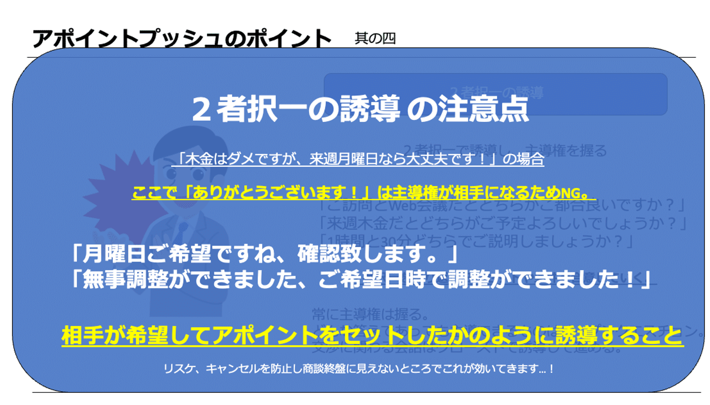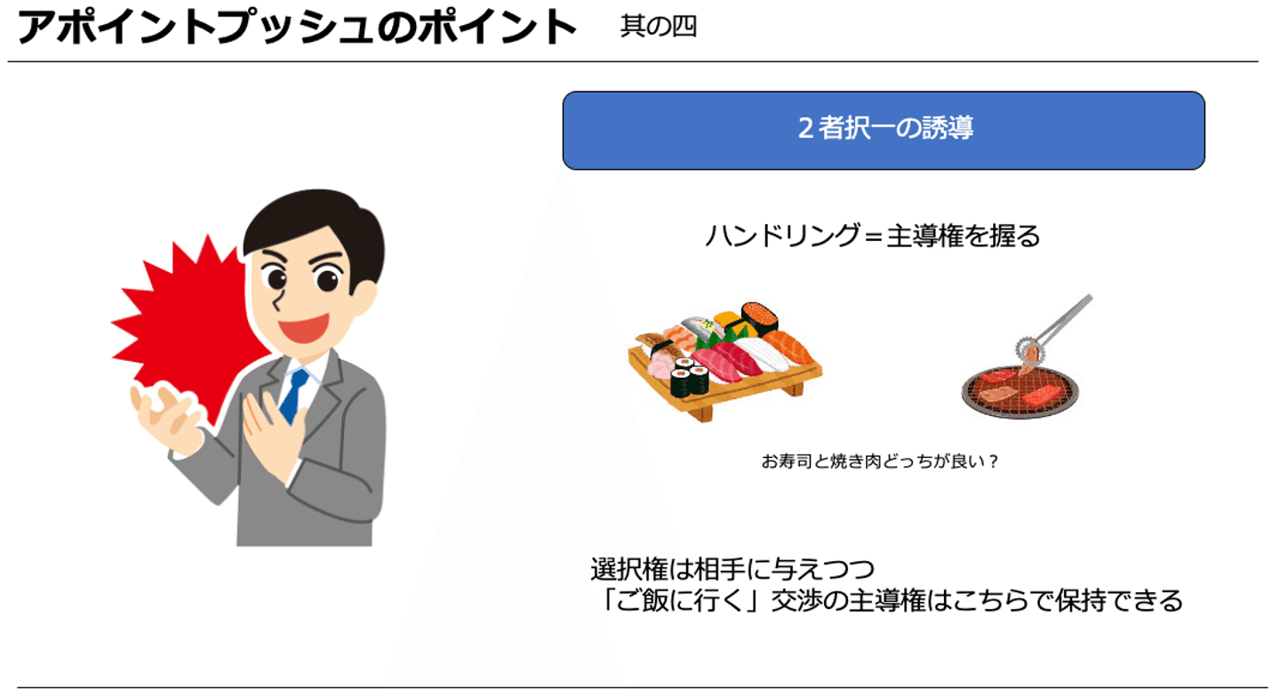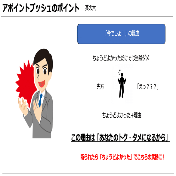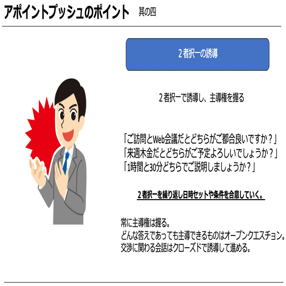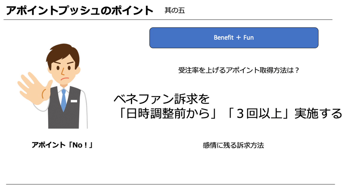 「アポイントを下さい」ということを忘れないということを認識いただけたら嬉しいです。