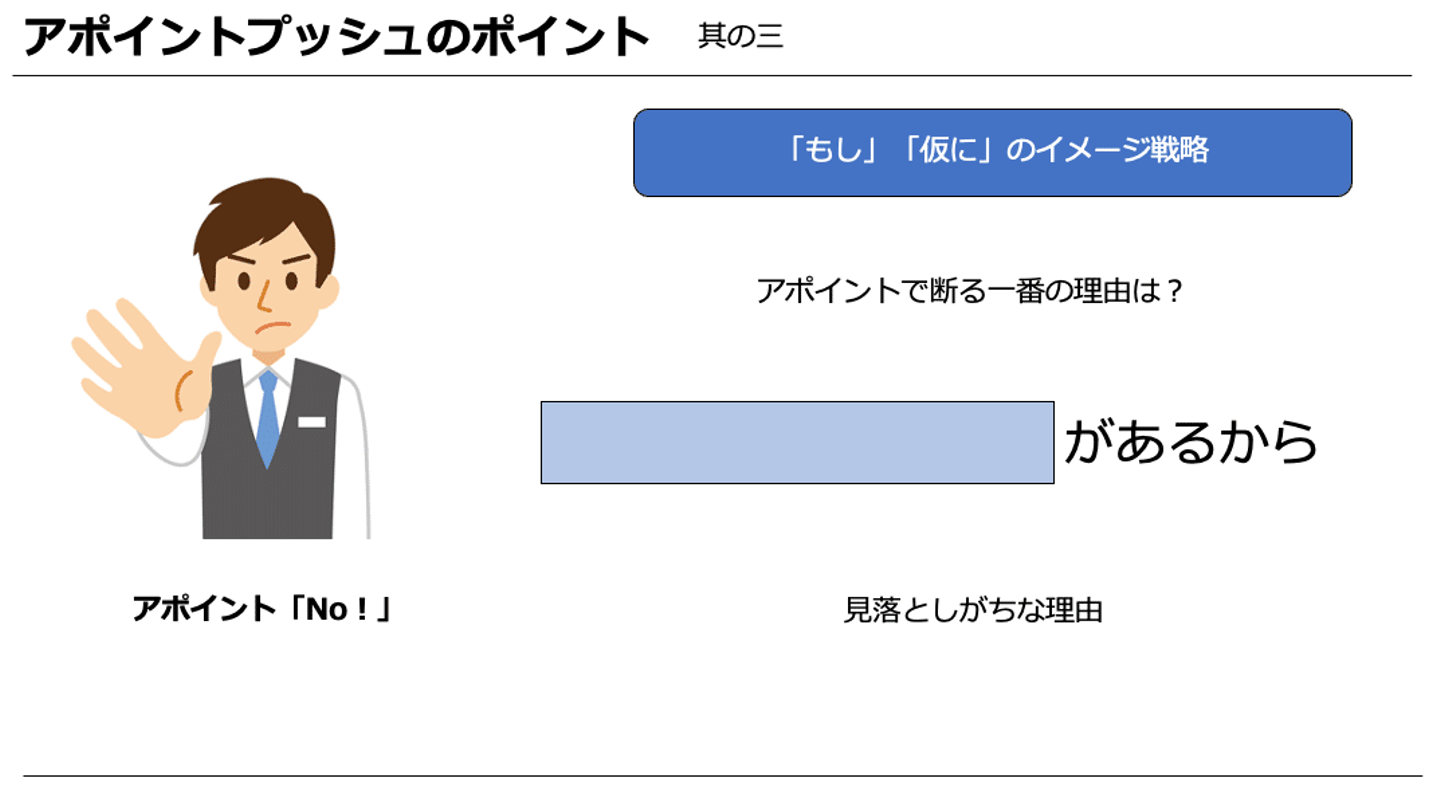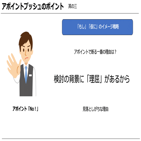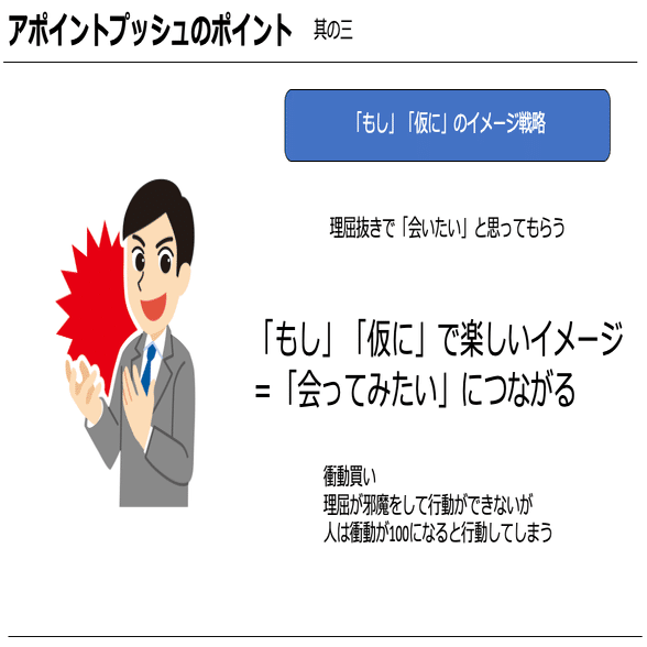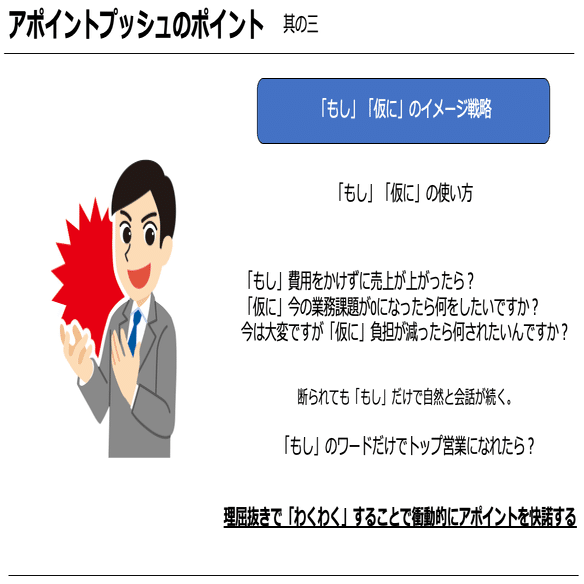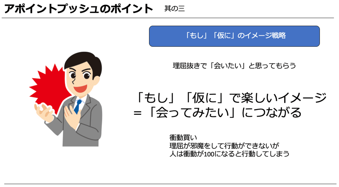 「もし」「仮に」のフレーズを使うことでアポイントへの衝動を100にする。