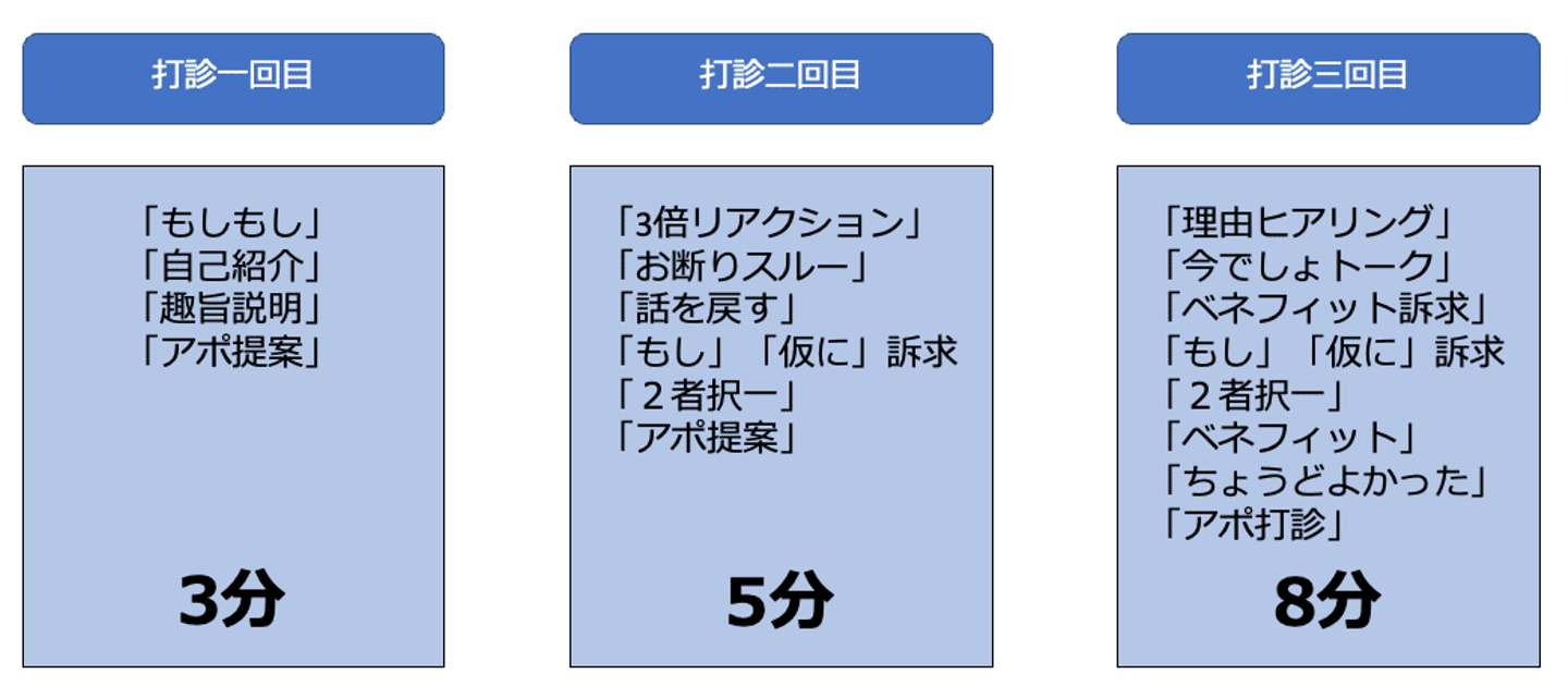 また、粘ってもアポイントに至らない場合でも3回めの訴求で理由を聞くことができればメモとして残し、然るべきタイミングで適切なCallを行うことが出来ます。