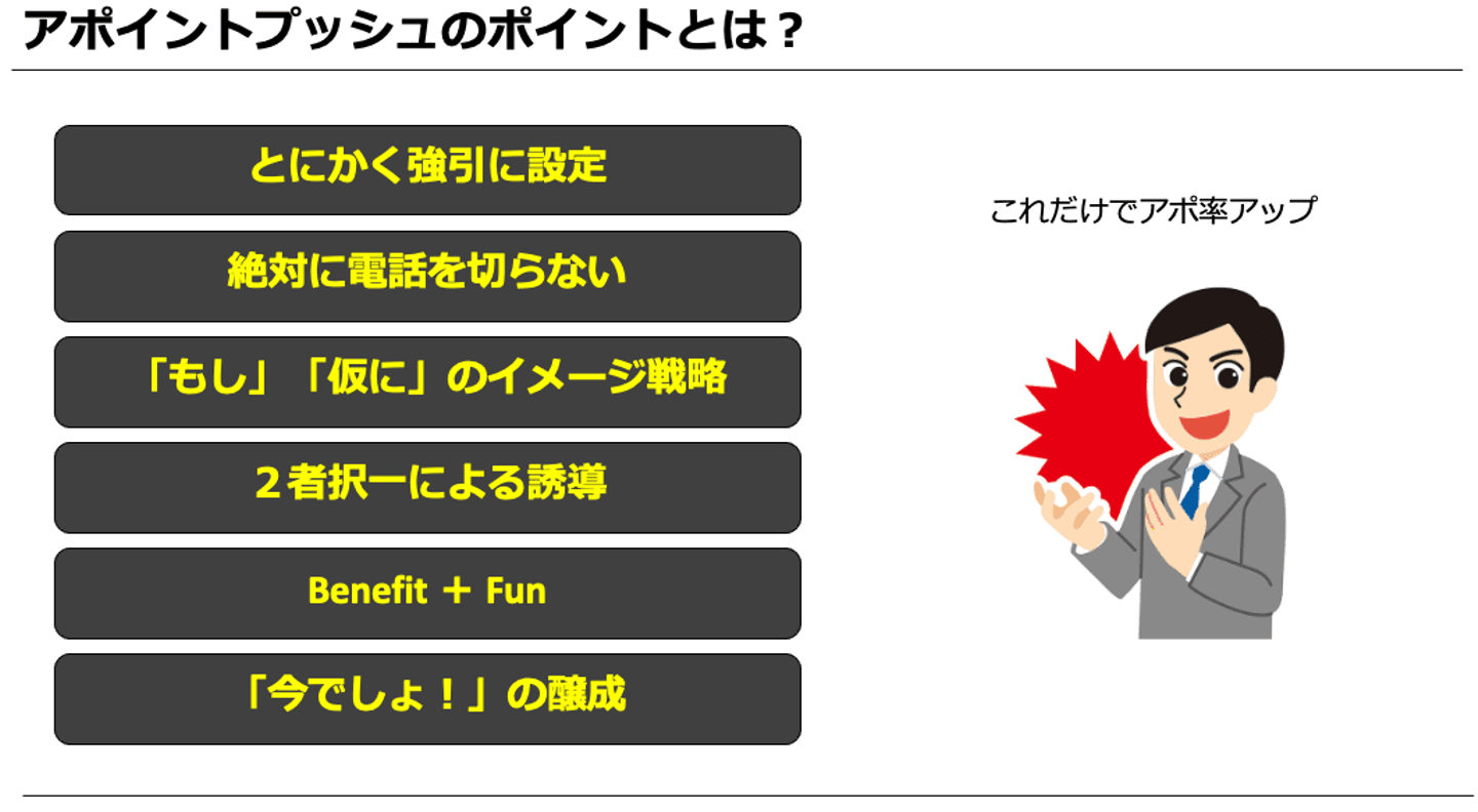 世の中にいろいろな記事、Note、書籍が出ていますが、個人的に考えた基本的なアポイントプッシュのポイントを纏めてみました。