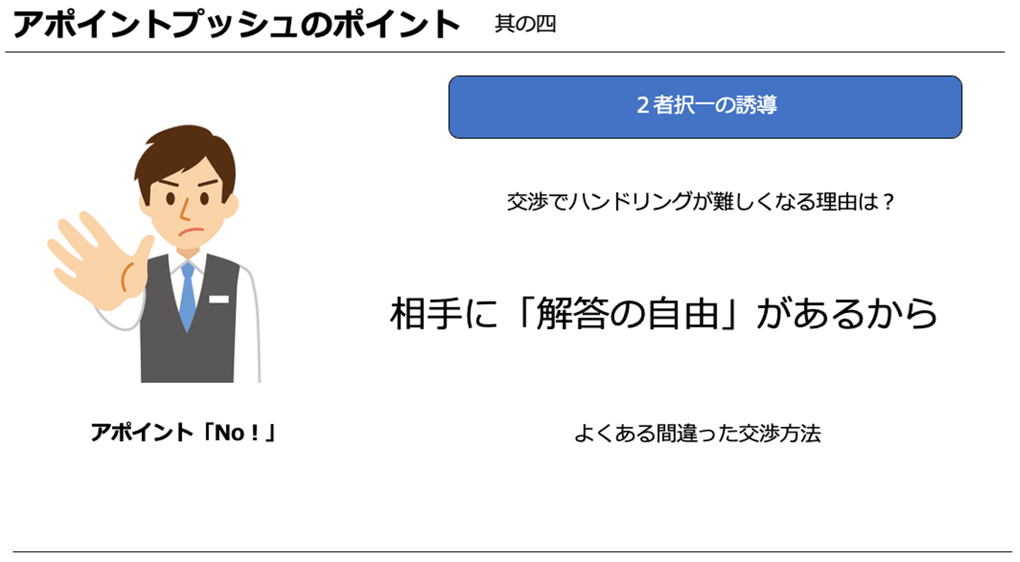 商談も、アポイント取得もそうですが、相手に解答の自由があると交渉の難易度はぐっと上がります。