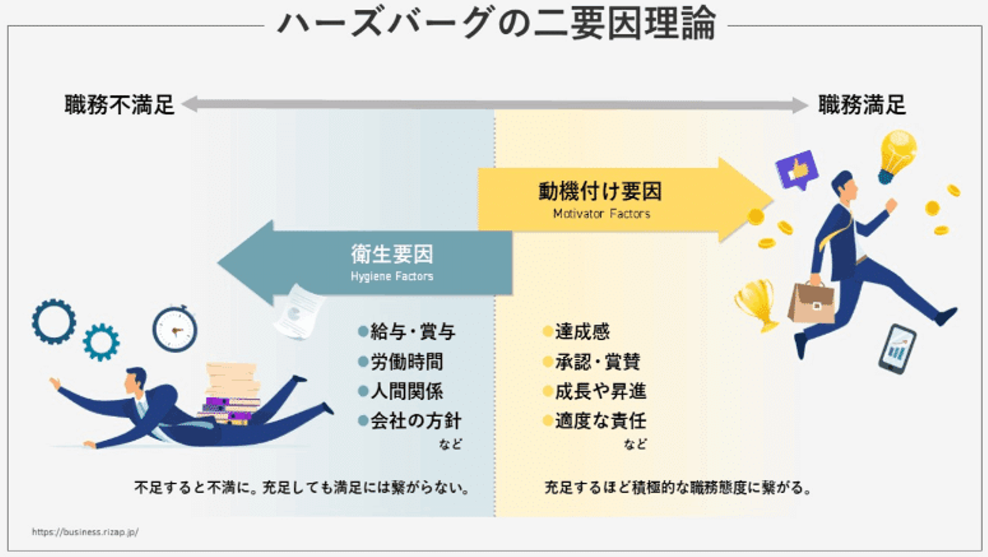 「衛生要因」という不満足に関わるものと、「動機付け要因」という満足度に関わるもので構成されていることが特徴です。