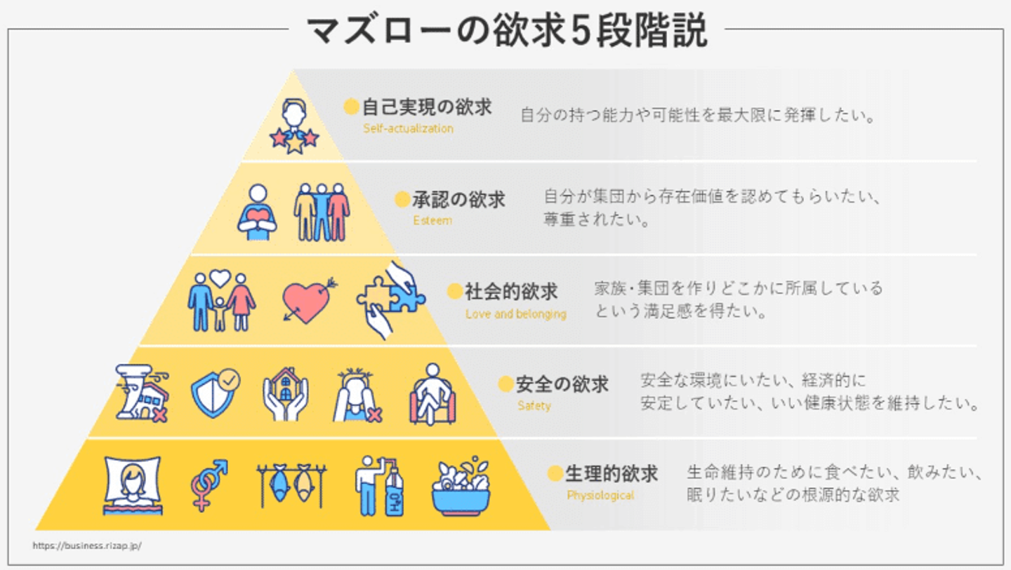 マズローは、人間の欲求には「生理的欲求」「安全欲求」「所属と愛・社会的欲求」「自尊心」「自己実現」という階層があり、低次元の基本的な欲求が満たされることで、次の欲求が行動を支配するという欲求5段階説を提唱しました。
