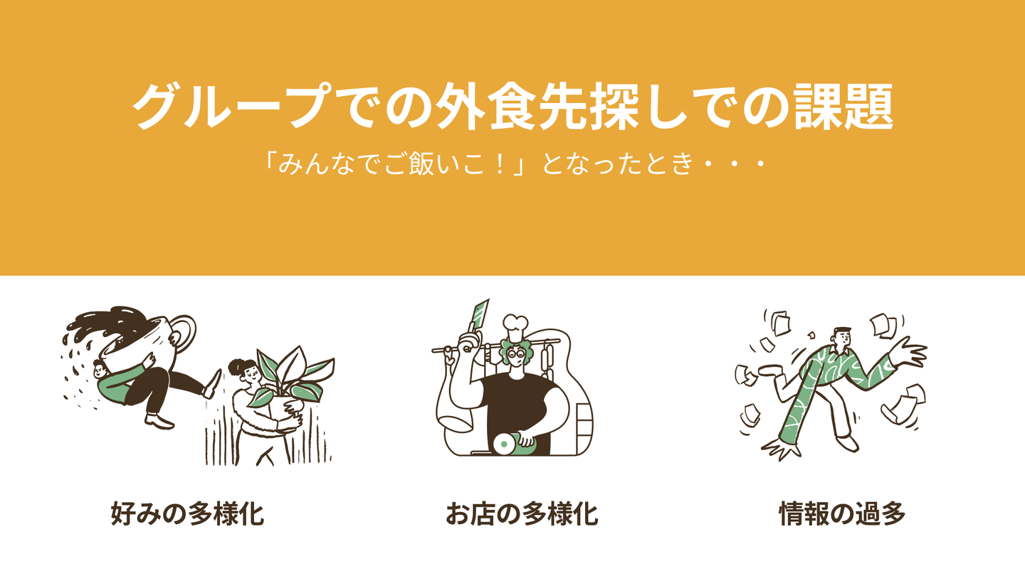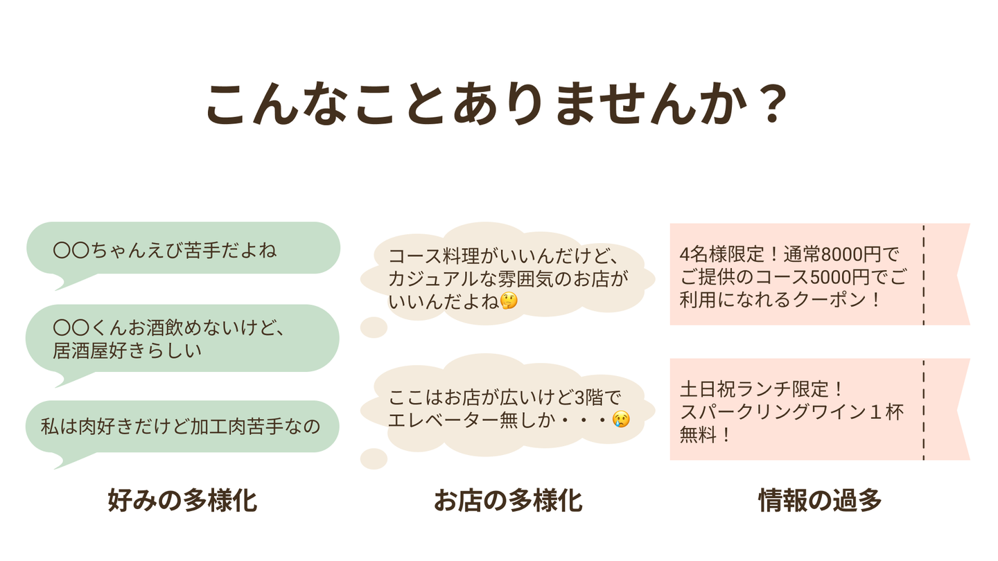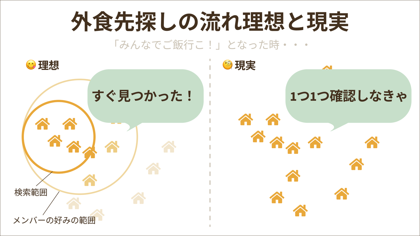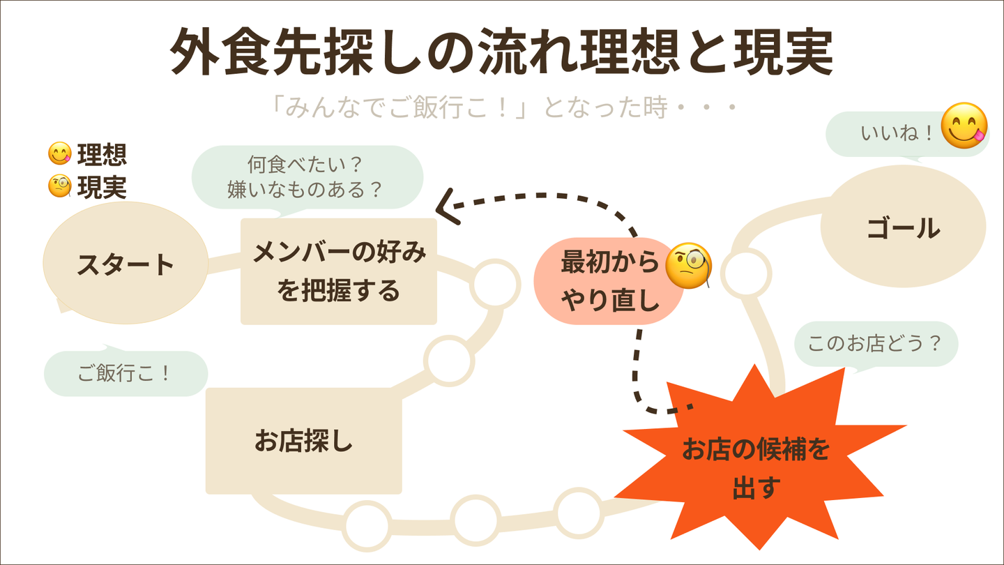 - 現実:仲の良い友人や家族でない限りは、1つ1つ好き嫌いをヒアリングして、お店を提示してを繰り返して決める