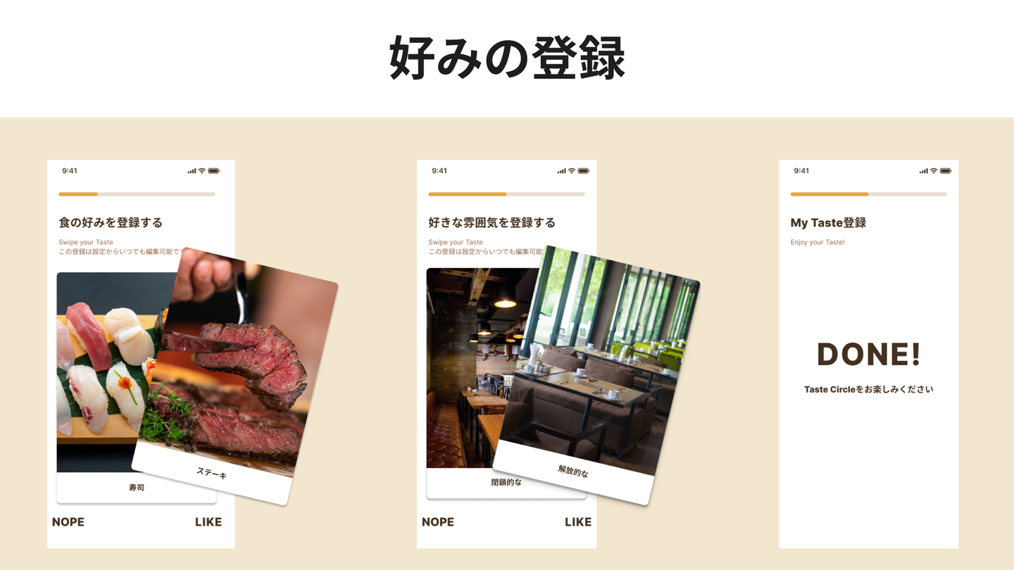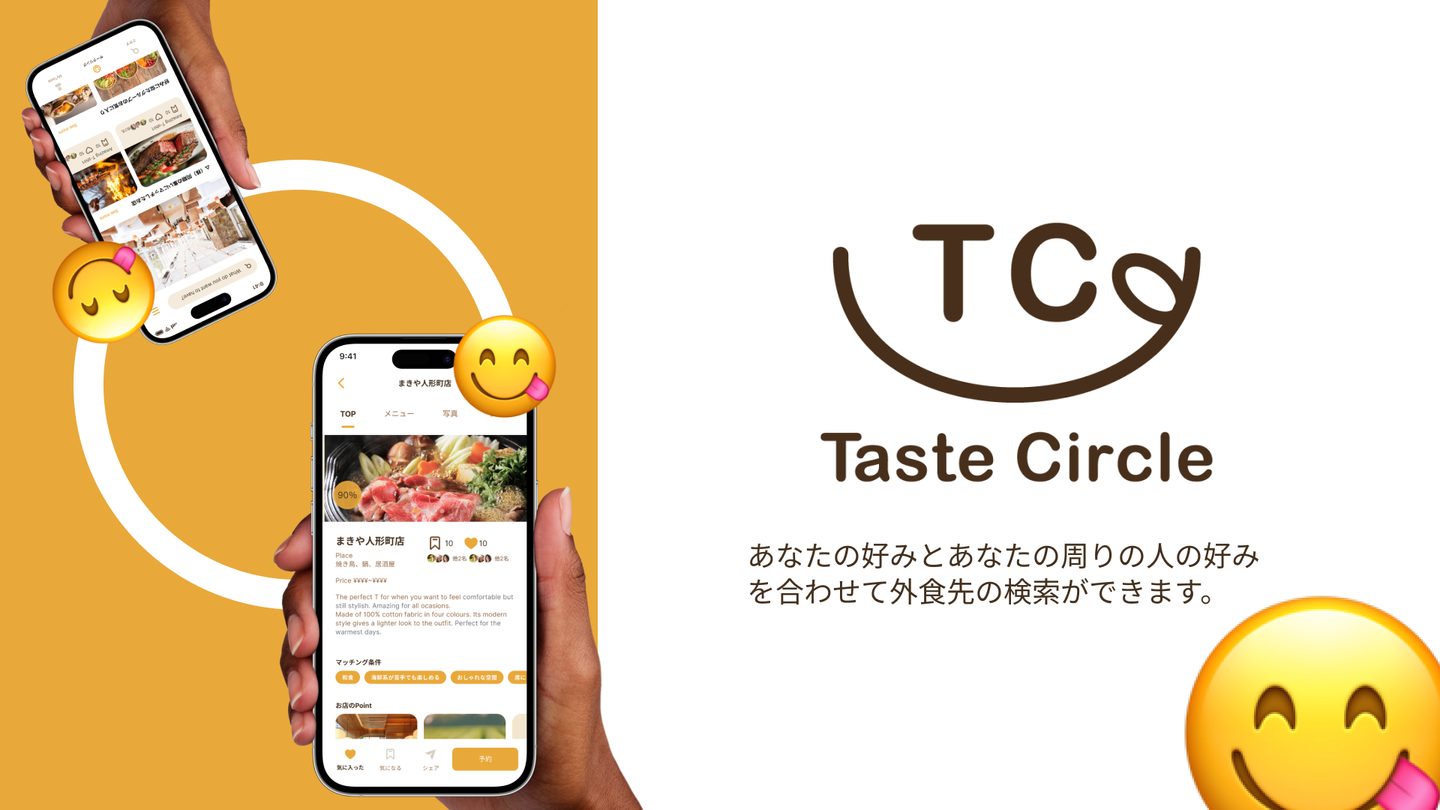 Taste Circleは、「食卓を囲む全員が楽しめる世界を。」をビジョンに制作しました。グループでの外食は”コミュニケーション”の為に行うもの。人々の多様性が尊重される今、あなたの隣の人は楽しめているでしょうか?ユーザーはメンバーの多様性を理解し、最適なお店を見つけ、食事を楽しむ。お店は得た情報で更にサービス向上する。そんな未来を描いたサービスです。
