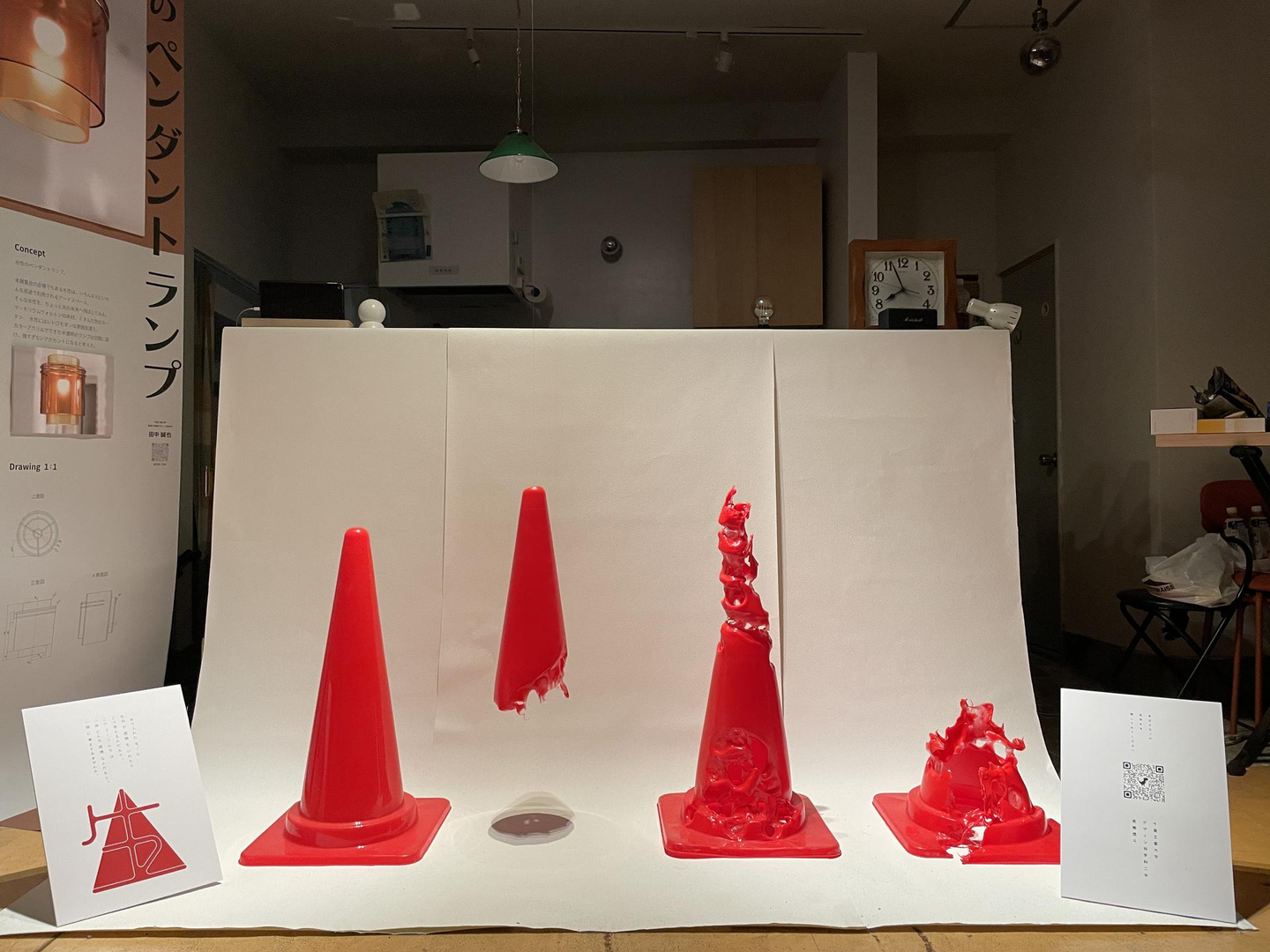 照明のレイアウトも結構苦戦していました。グループ展示なのでこのカラーコーンの周りには他の人の作品があったので他の作品を邪魔せず、かつお客さんの影がカラーコーンにうつらないような、ノイズなくカラーコーンを見てくれるような照明の配置を展示会前日何時間も試行錯誤をかさねていました。