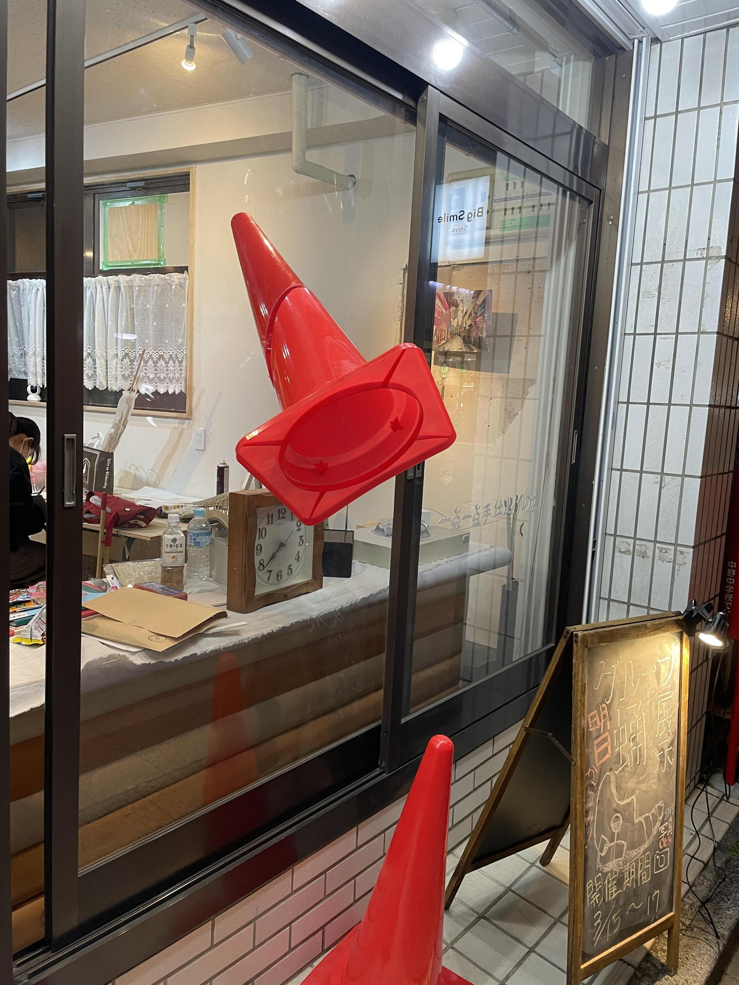 展示会場が商店街の一部だったため人はたくさん通っていましたが他の店に紛れているような場所だったため通行人の方がスルーしてしまうことが多くあるように感じました。そこで個性的なカラーコーンにこの展示のシンボル的な役割を担えないかと考え”窓ブッ刺さりコーン”を設置しました。