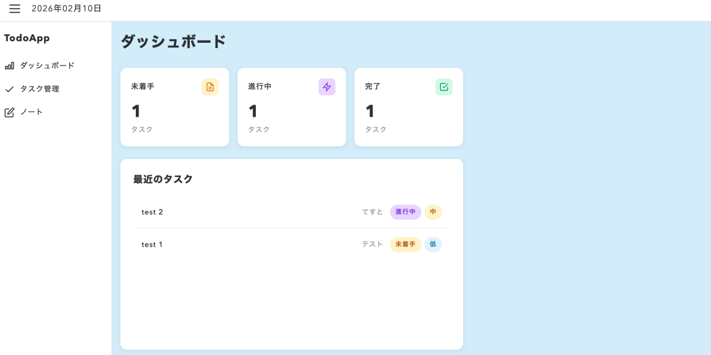 このアプリのメイン画面になります。一目見てタスクの名前、内容、数と進行度、優先度がわかるようにしています。「最近のタスク欄」は優先度順で上から表示し、完了したタスクは表示されないようにしています。