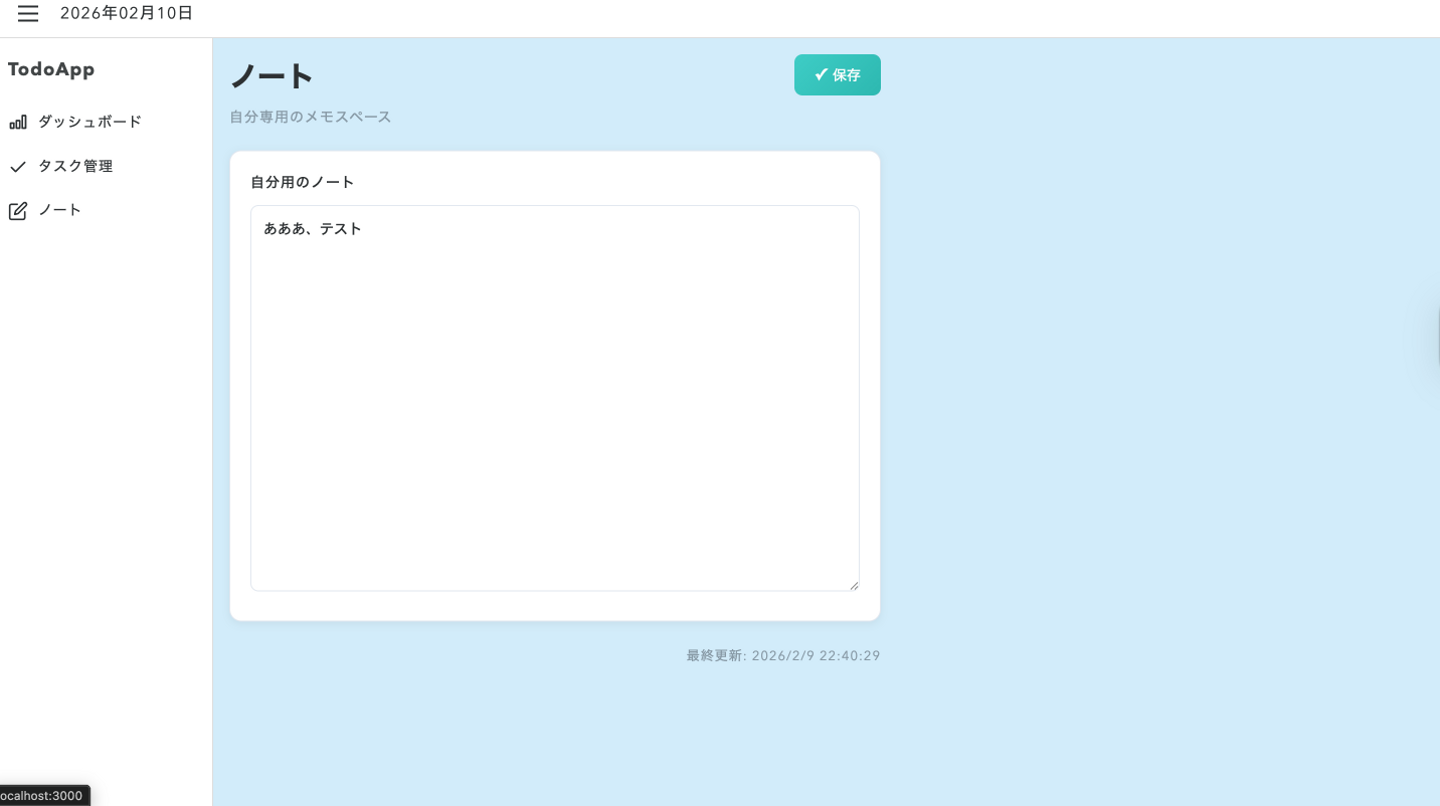 メモとか自由にテキストを書けるページです。保存を押すことで書いた内容を保存でき、最終更新日時が右下に表示されます。