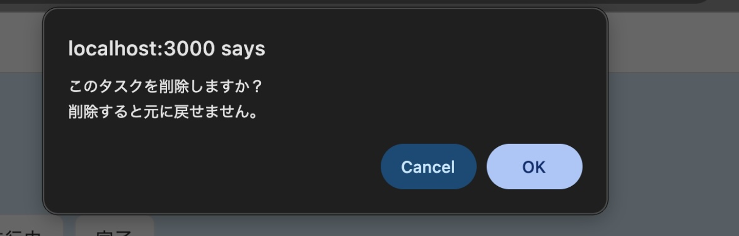モーダルを開いている間は、Escキーで閉じる・Tabキーでモーダル内にフォーカスを循環させる制御を入れています。キーボード入力はブラウザ側のイベントとして発生するので、リアルタイムに反応する処理はJavaScriptが必要でした。 - 削除前の確認ダイアログ