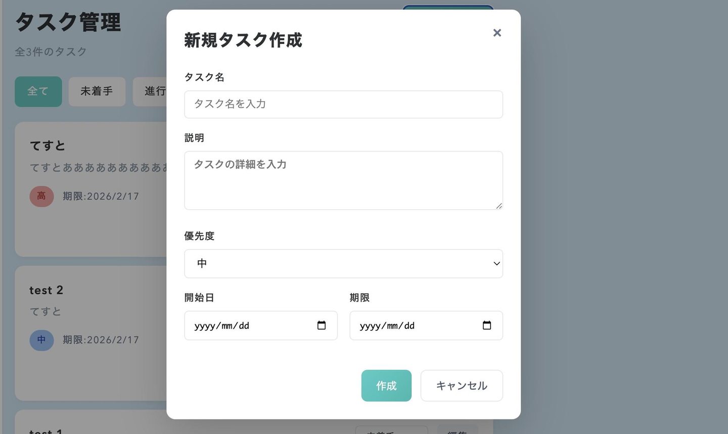 新規作成ボタンを押すことでこの画面が表示され、新規タスクを作成することができます。優先度は低、中、高の三つです。開始日と期限はカレンダーマークを押すことでカレンダーから日付を選択することができます。