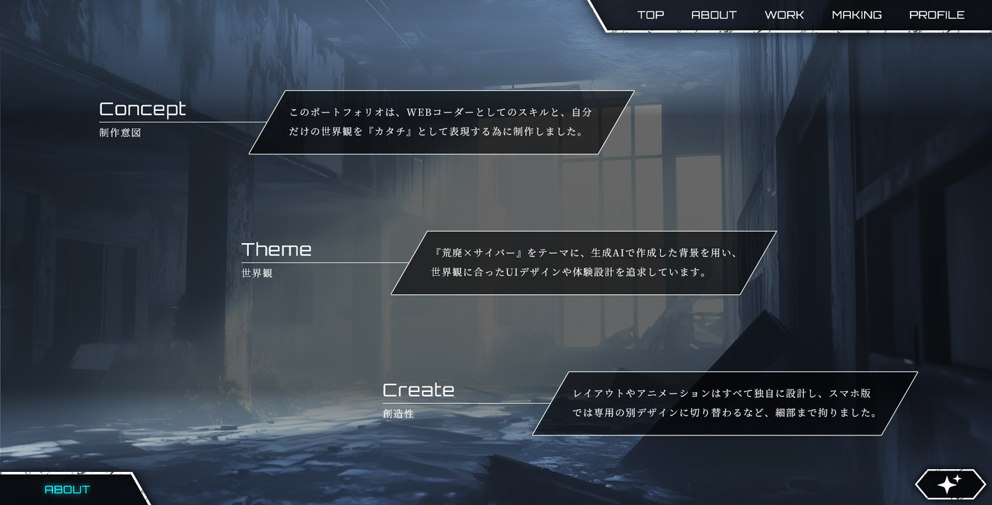 制作物紹介するセクションでは、模写サイトしか実績がないので、世界観に対して弱いと感じました。