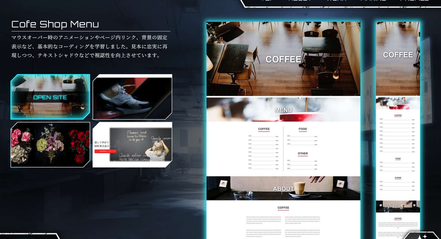 そこで、サムネにカーソルを合わせるだけで説明文とサイト画像が切り替わる演出を設計し、模写のみの弱さをユーザー体験に昇華させました。