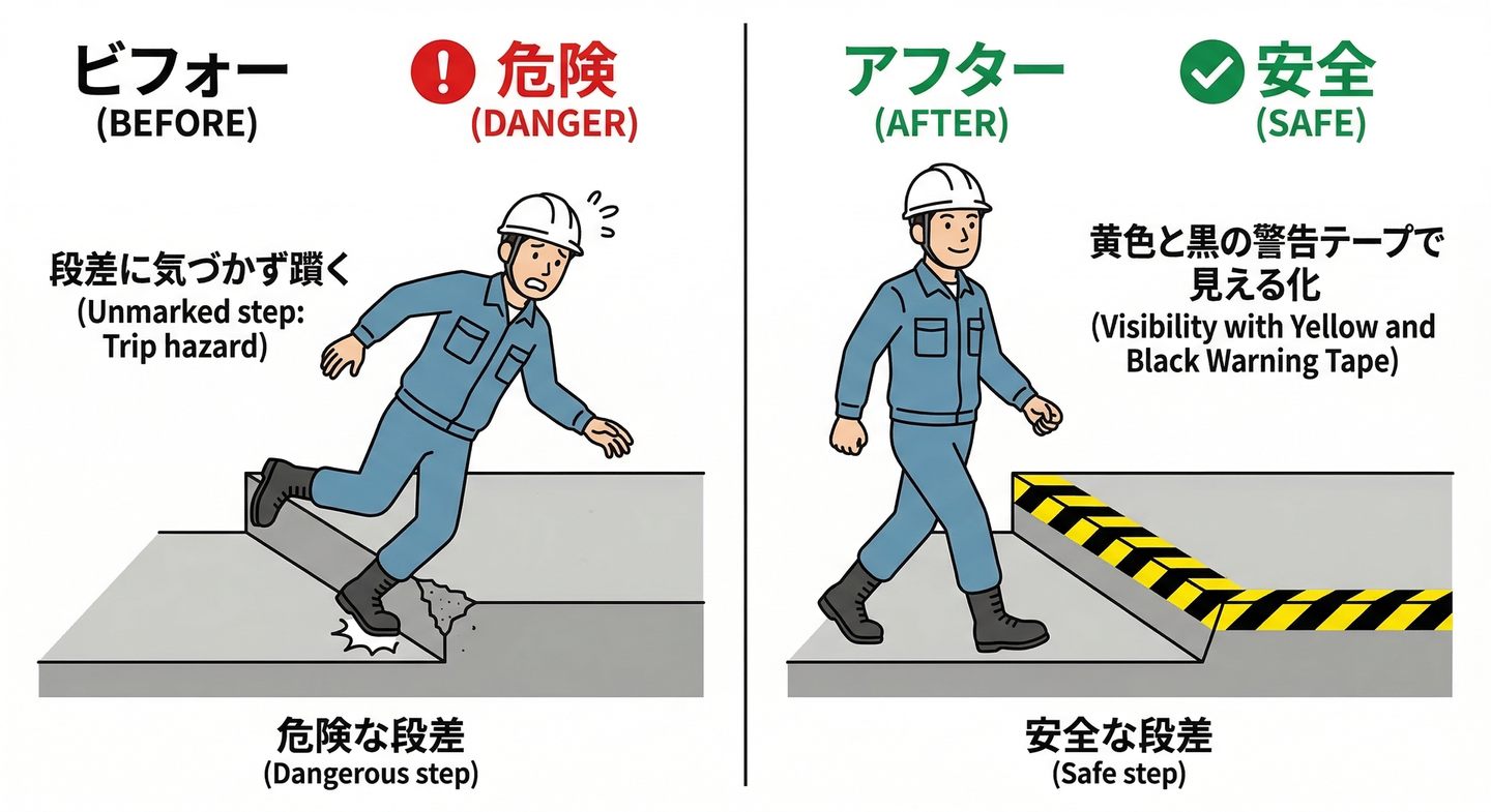 全ての段差に黄黒テープ。(虎テープ)仮設階段の踊り場、現場入口など人の視線が自然に向く場所に、危険の注意を配置する。「見せる」ではなく「見えてしまう」状態をつくる。