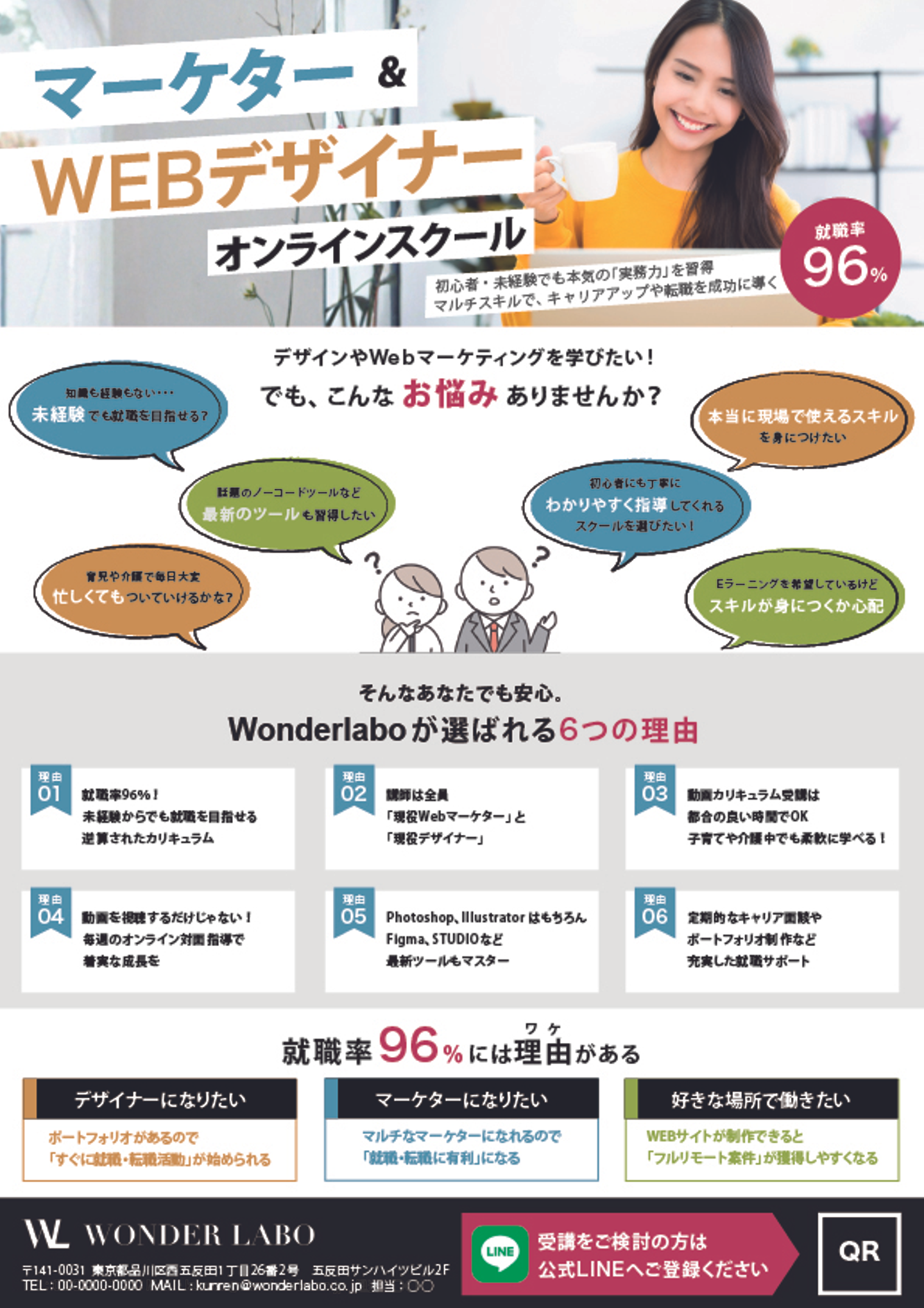 オンラインスクール紹介フライヤーのデザイン制作しました 橋爪 理恵 その他デザイナー on 2025/12/23 オンラインスクール紹介フライヤー【案件概要】依頼内容:オンラインスクールを紹介するためのフライヤーを作成してほしい。目的:チラシを見て入校の申し込みをしてもらいたい。使用用途:自由に手に取って持ち帰りができるようにハローワークへ置いておきたい。要望:後からスマホで簡単に申し込みができるようにQRコードを付けたい。【どのような考えでデザインしたか】ハローワークに置くとのことなので、強みである高い就職率の実績数字を一番上に表記し、読み進めるとなぜ就職率が高いのか、また、初見の方でも迷わず内容を理解できる構成にしました。 橋爪理恵 - foriio 大学卒業後、IT業界にてシステムエンジニアとして従事。 また、アパレルのECサイト運営業務を経験して参りました。 さらなる業務の幅を広げるべく、SNS運用などのマーケティングの基礎知見や、 Photoshop、Illustrator、Figma、STUDIOといったツールの習得を目指し職業訓練校に入校。 フライヤー、バナー、Webサイトなど制作しております。 オンラインスクール紹介フライヤーのデザイン制作しました 橋爪 理恵 Illustrator 制作 デザイン フライヤー シェア