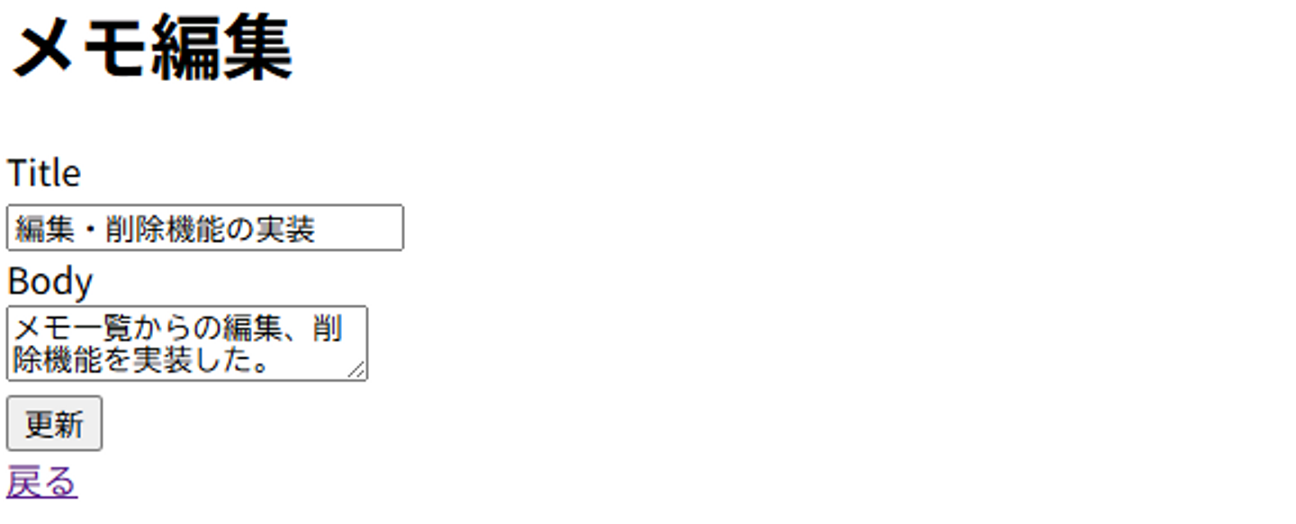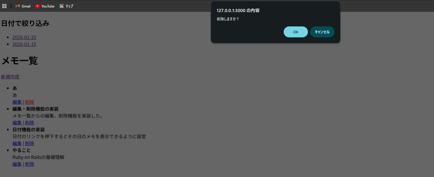 指定したメモを削除し、一覧画面に戻す処理を実装。