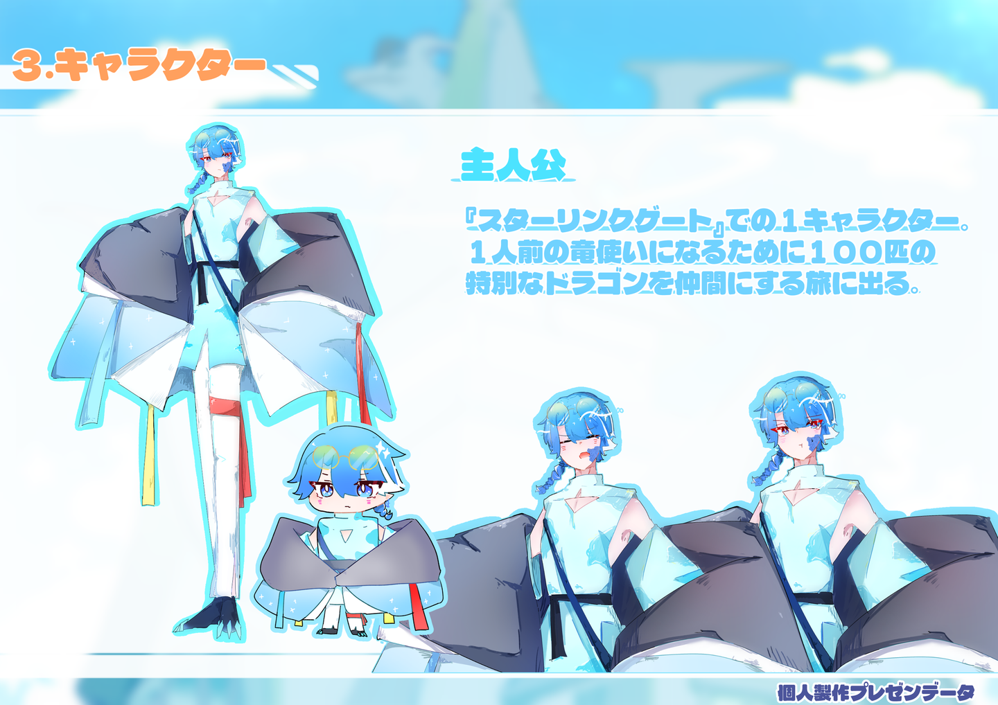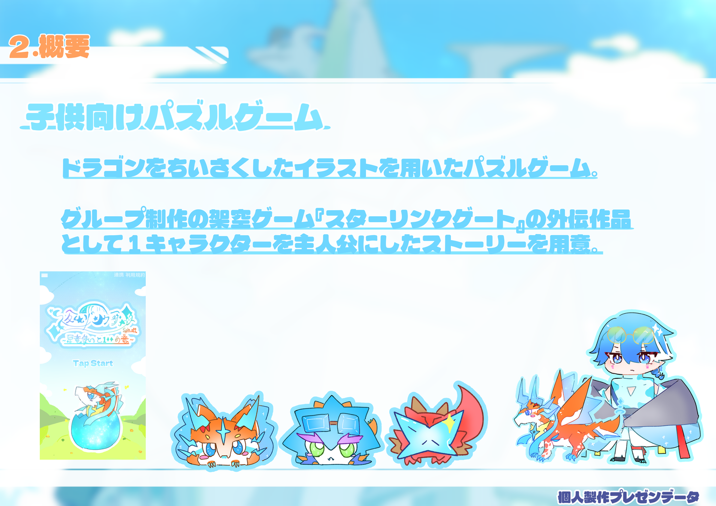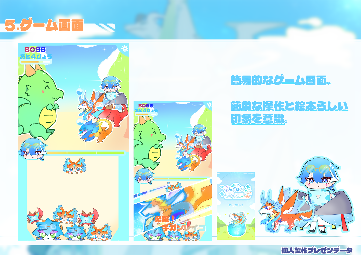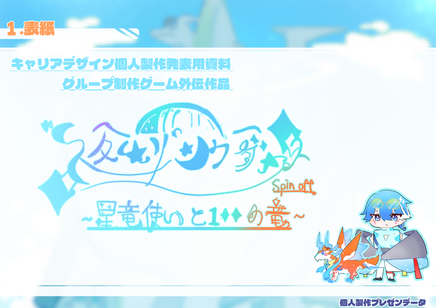 【課題製作】 架空ゲーム発表 外間 仁 学生 on 2026/02/18 2025年7月頃に学校課題で製作した架空ゲームの発表用資料です。【グループ制作】・1部キャラクターデザイン・立ち絵製作・ゲーム画面イメージ製作・ロゴ色彩【個人製作】 【課題製作】 架空ゲーム発表 外間 仁 イラスト制作 シェア