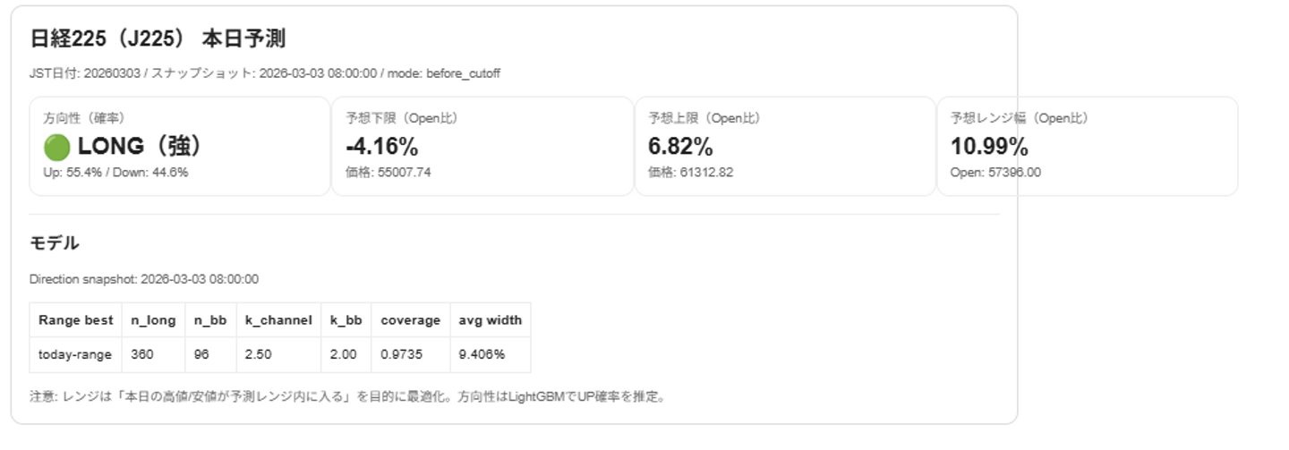 日経225の価格予測モデルを2時間で作ってみた 小林 美穂 アルゴリズムトレーディング戦略の研究開発および実装 on 2026/03/03 日経225の今日の価格変動ってどうなの?を予測するLightGBMの機械学習をつかって2時間で作ってみた!!予測した価格変動のデータはHTML形式でGmailに勝手に飛びます♪こんな感じのメールが届くよ!使ったのはgoogleのAPI?なんちゃらみたいなの。あと、batファイルを作ったくらい。チャッピー先生に聞けばなんでも教えてくれるのでスムーズに作れました!みんなもやってみてね! 日経225の価格予測モデルを2時間で作ってみた 小林 美穂 Python 機械学習 開発秘話 lightGBM シェア