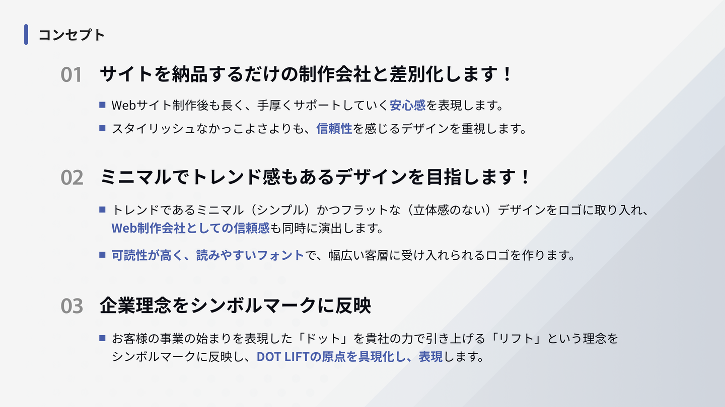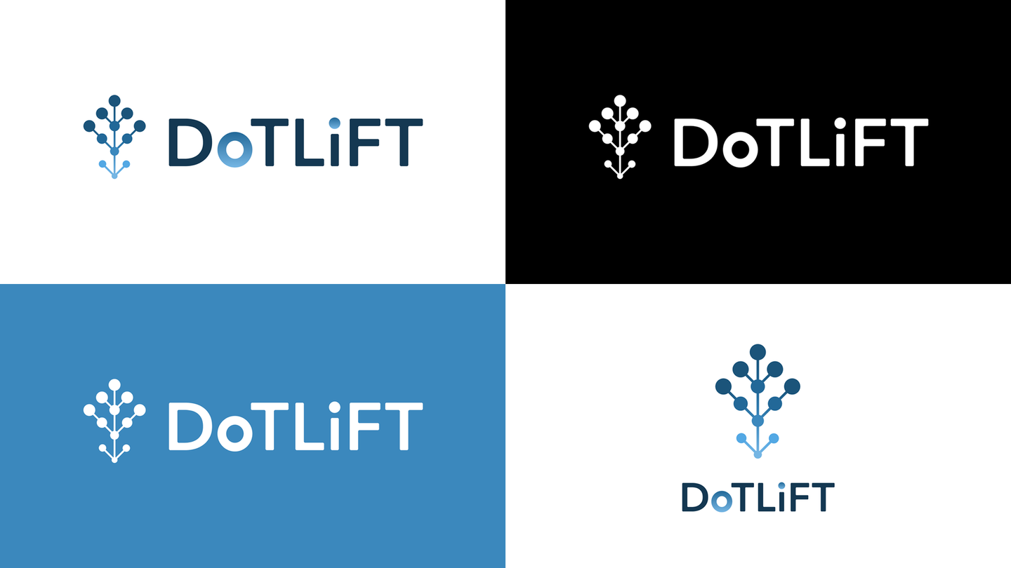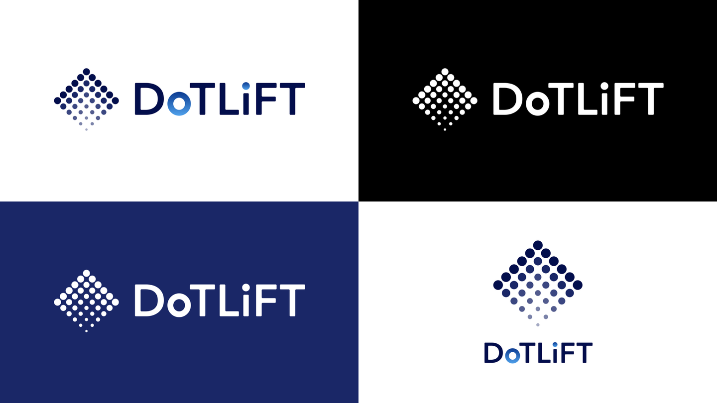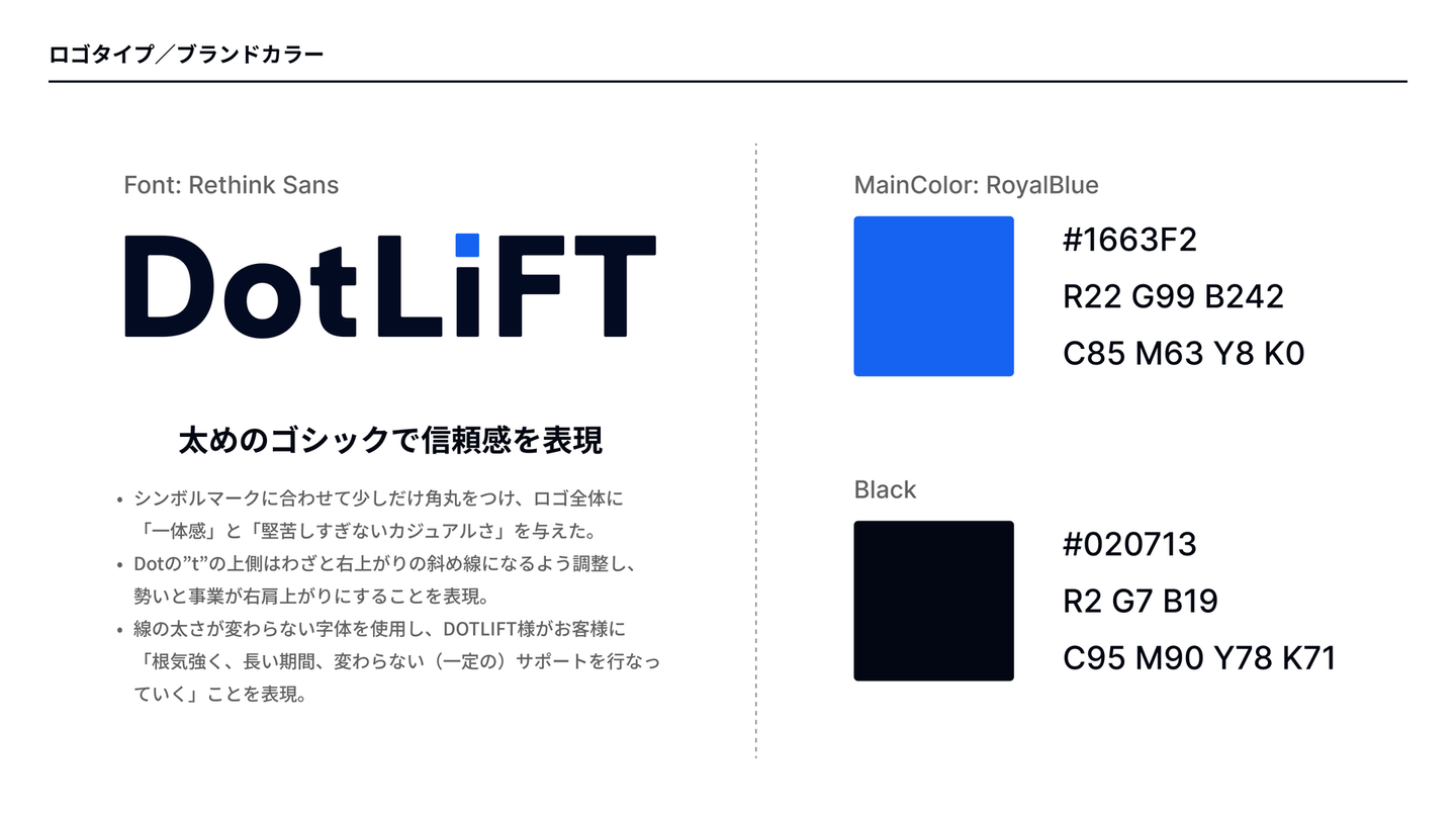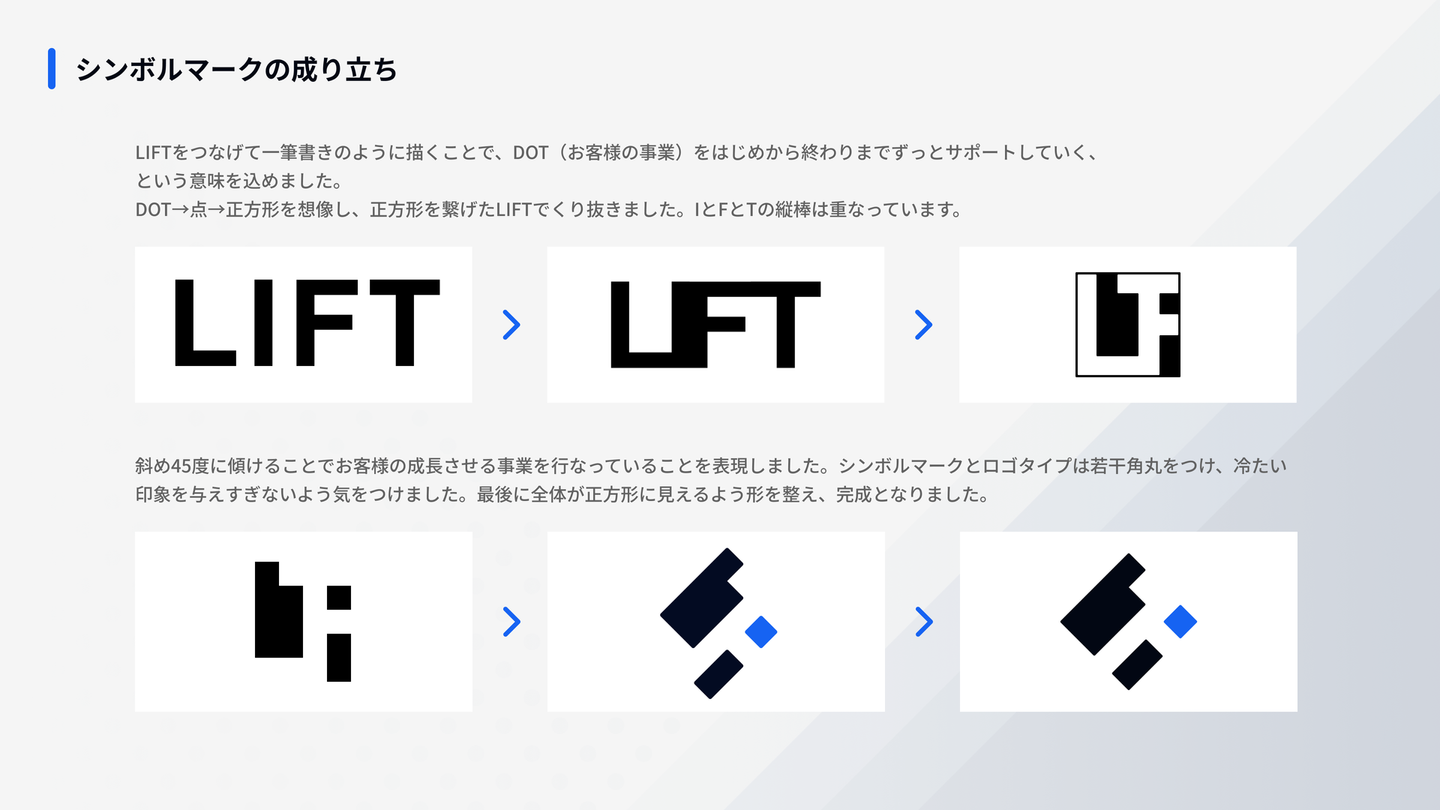 Dotの”t”の一部を斜めにカットしたり、LiFTの”i”を小文字にしてシンボルマークと合わせた青色の小さなドットを取り入れたり、細かな工夫を施しております。