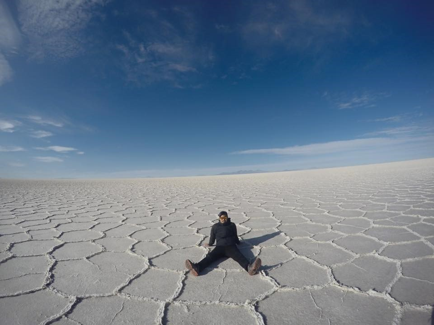 ボリビア、ウユニ塩湖にて。この数時間後に高山病で昏睡しました。