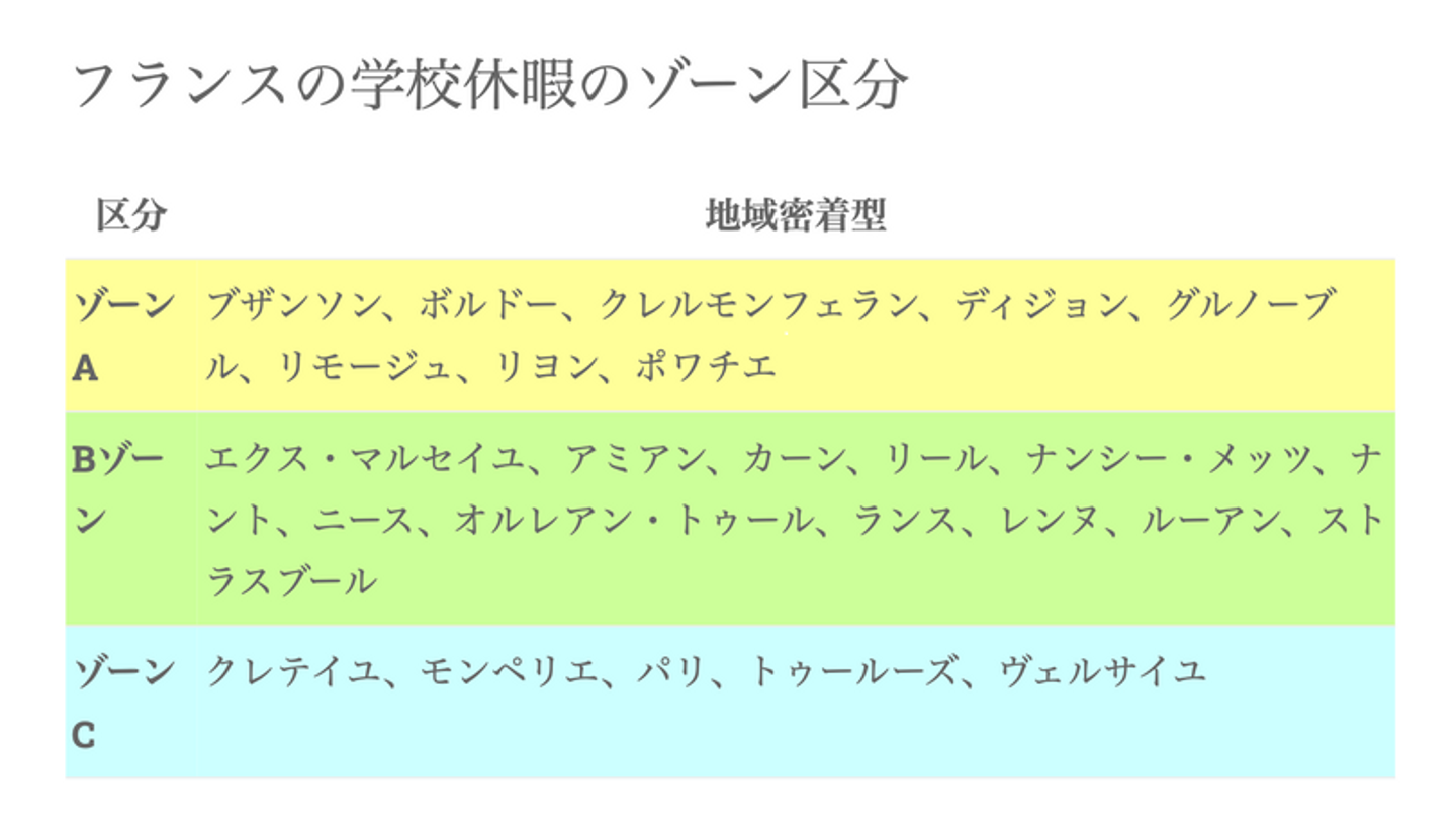 フランスの学校は、地域ごとにAゾーン・Bゾーン・Cゾーンに分けて、それぞれちょっとずつズラしてお休みを設定しているそうなんですね。