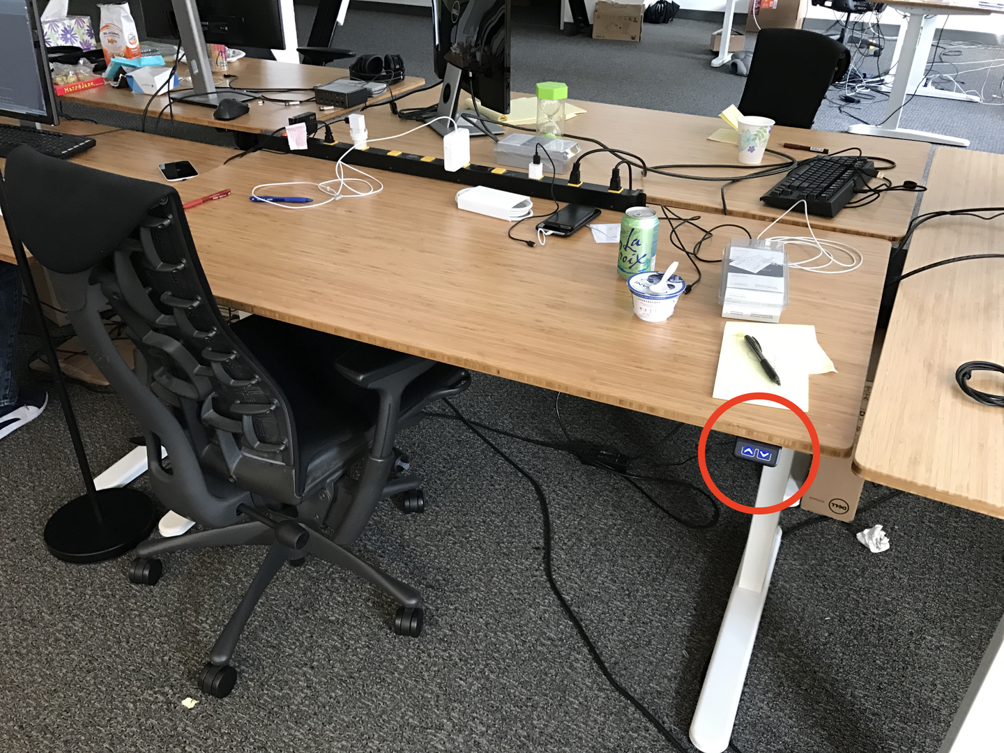 天板の右下にあるスイッチで高さを変えられるので、午後ちょっと睡魔に襲われるときとかは立って仕事してます。