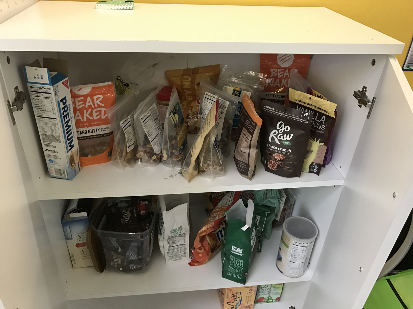 お菓子棚もあって、こちらも定期的にいろいろと入った段ボール箱が届いて補充されてます。